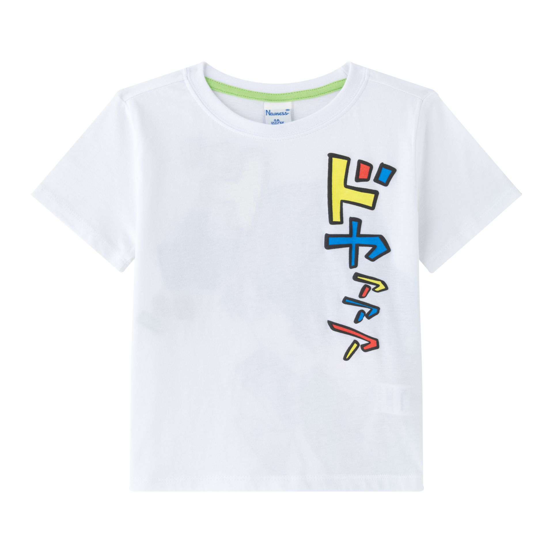 Camiseta algodón de niño de manga corta y cuello a la caja. Estampado al agua y alta densidad.