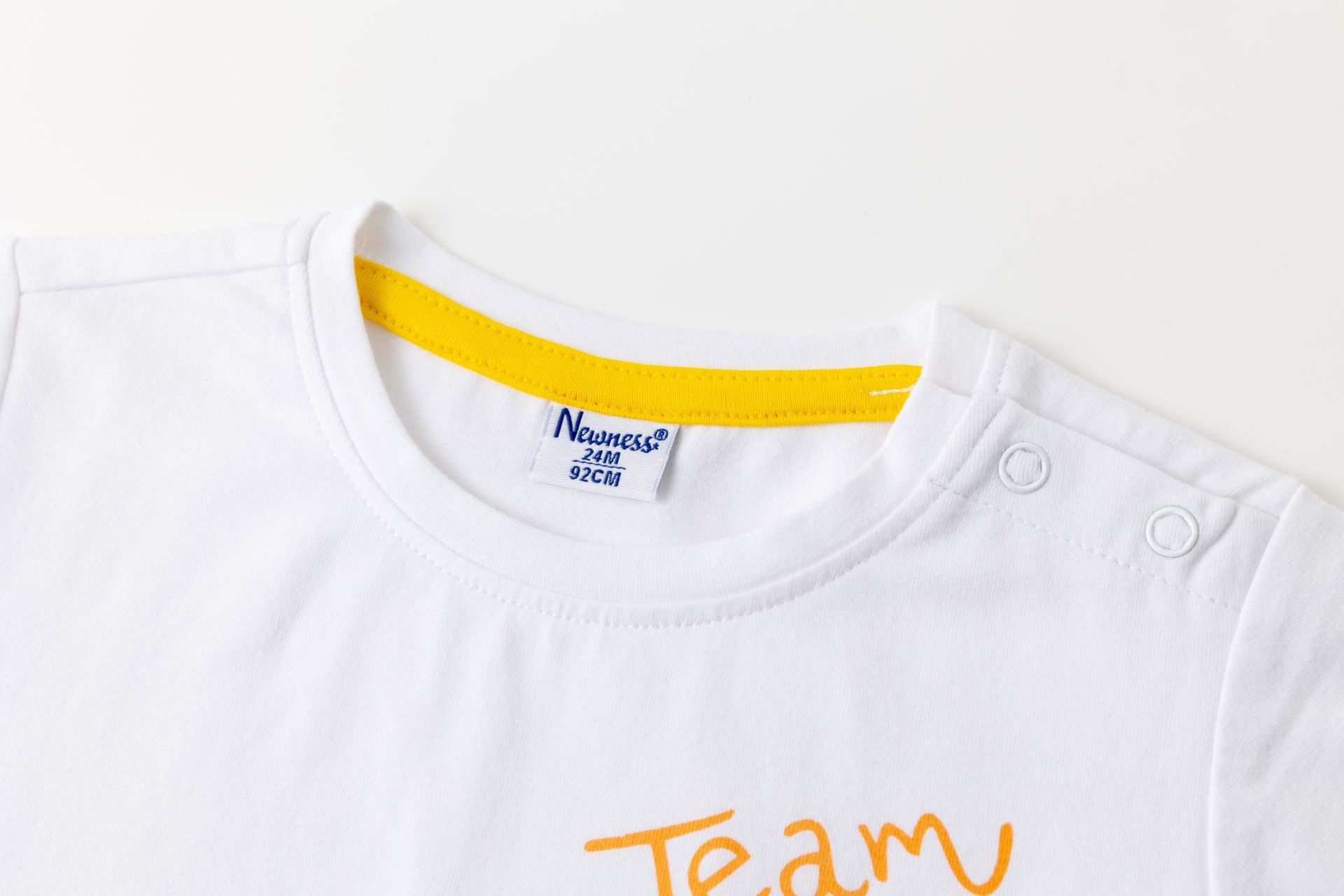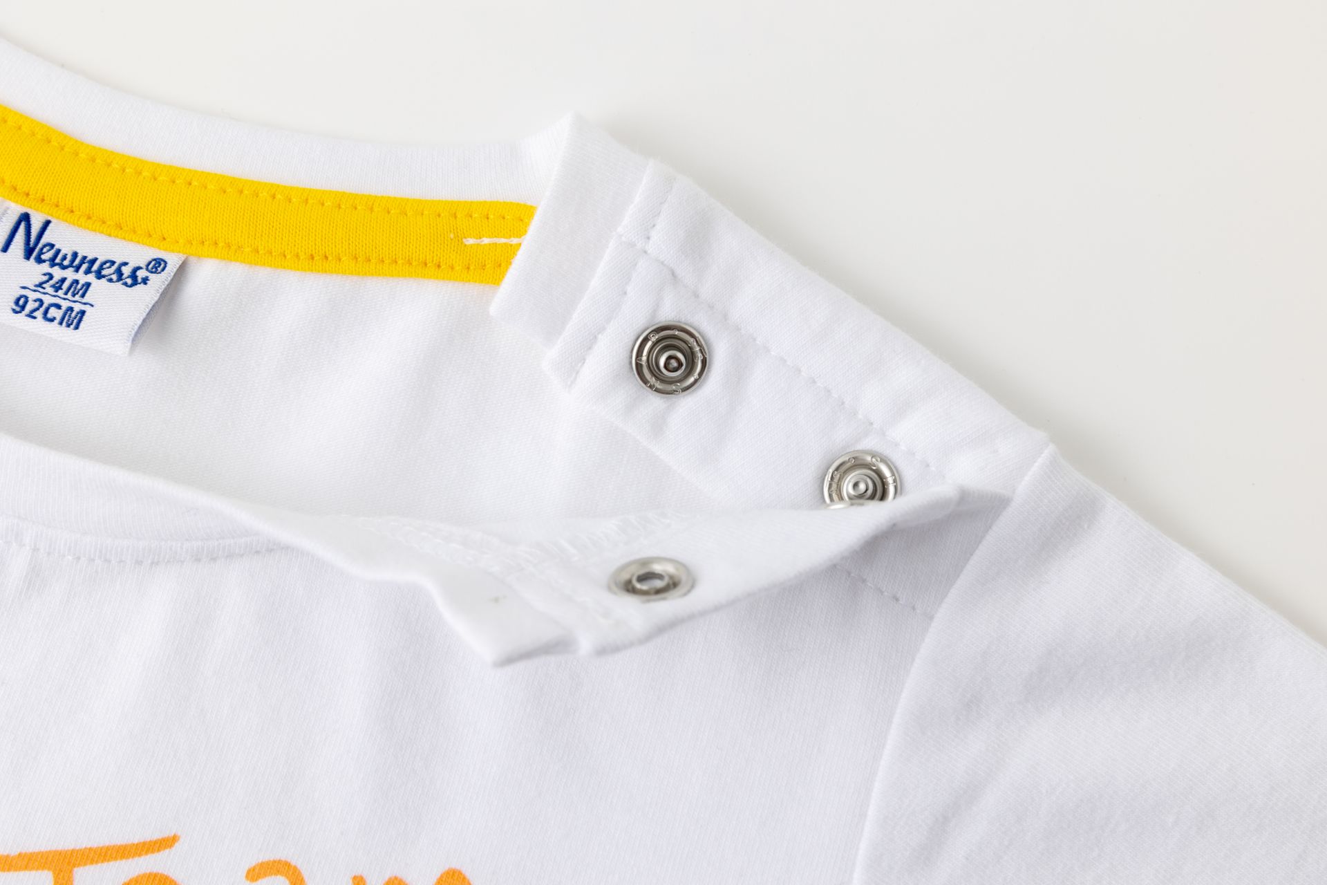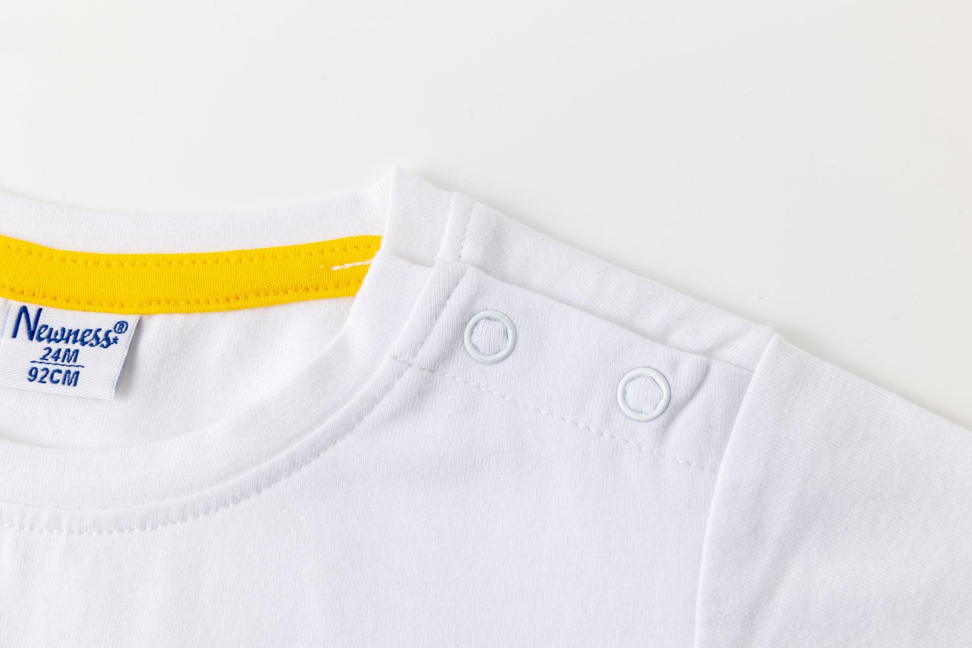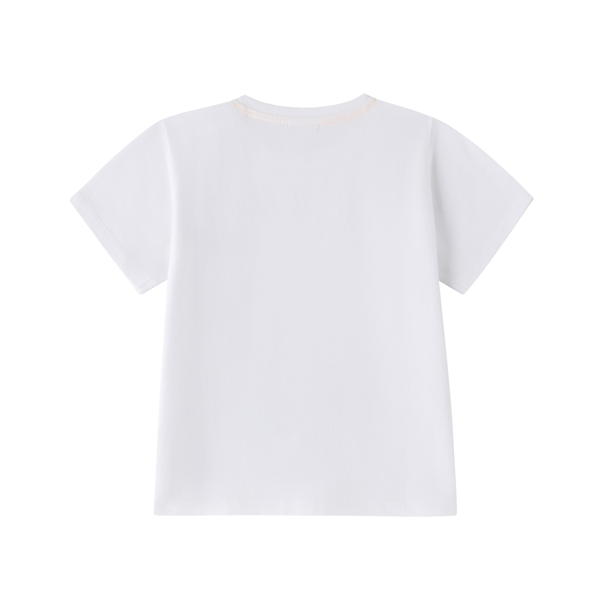 Camiseta de bebé niño en single jersey de manga corta y cuello a la caja. Abertura en hombro con corchetes. Etiqueta de tela bordada en bajo y estampado al agua en centro de la prenda.