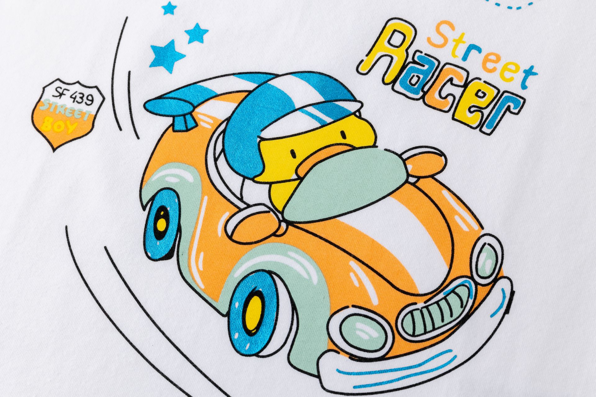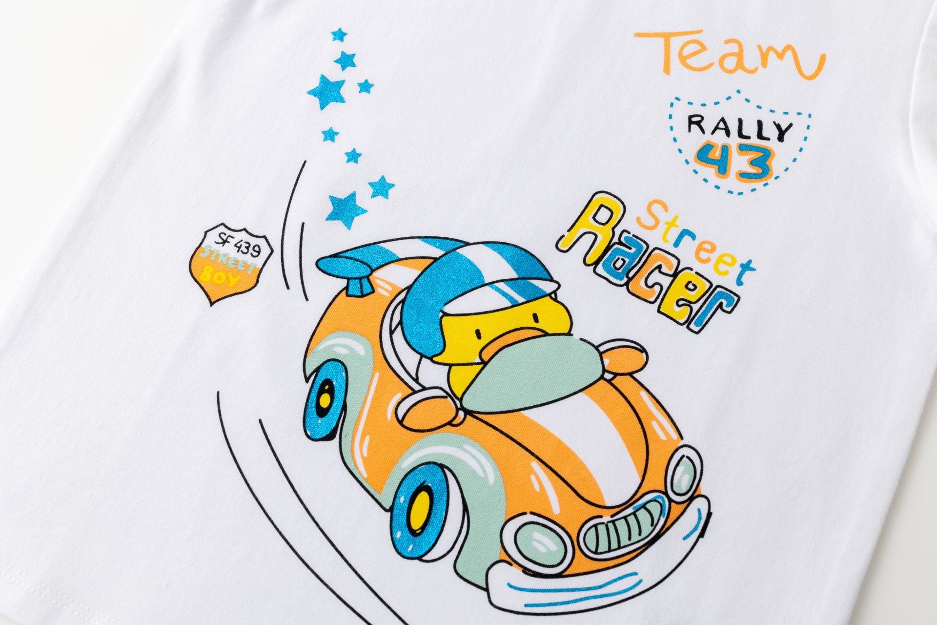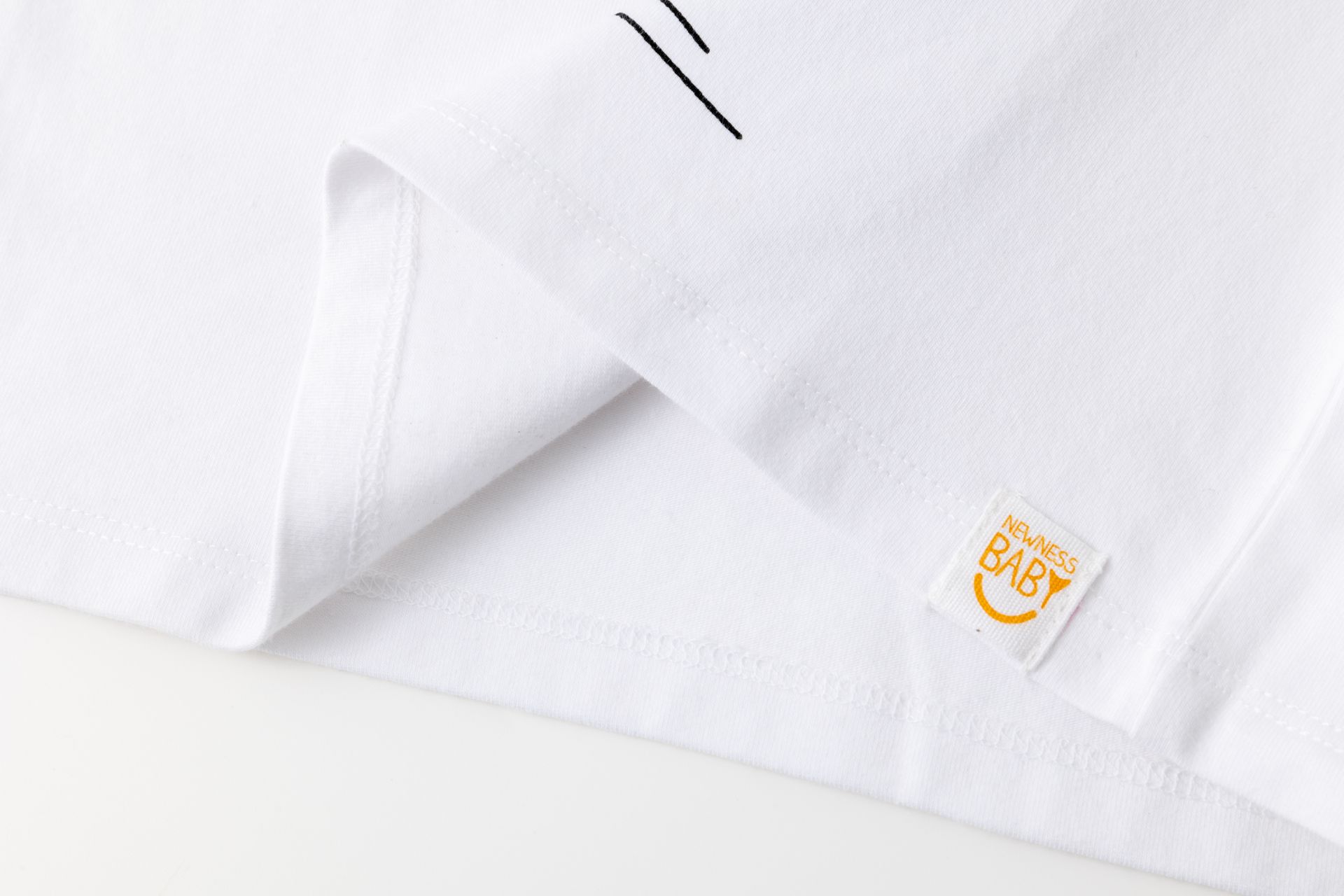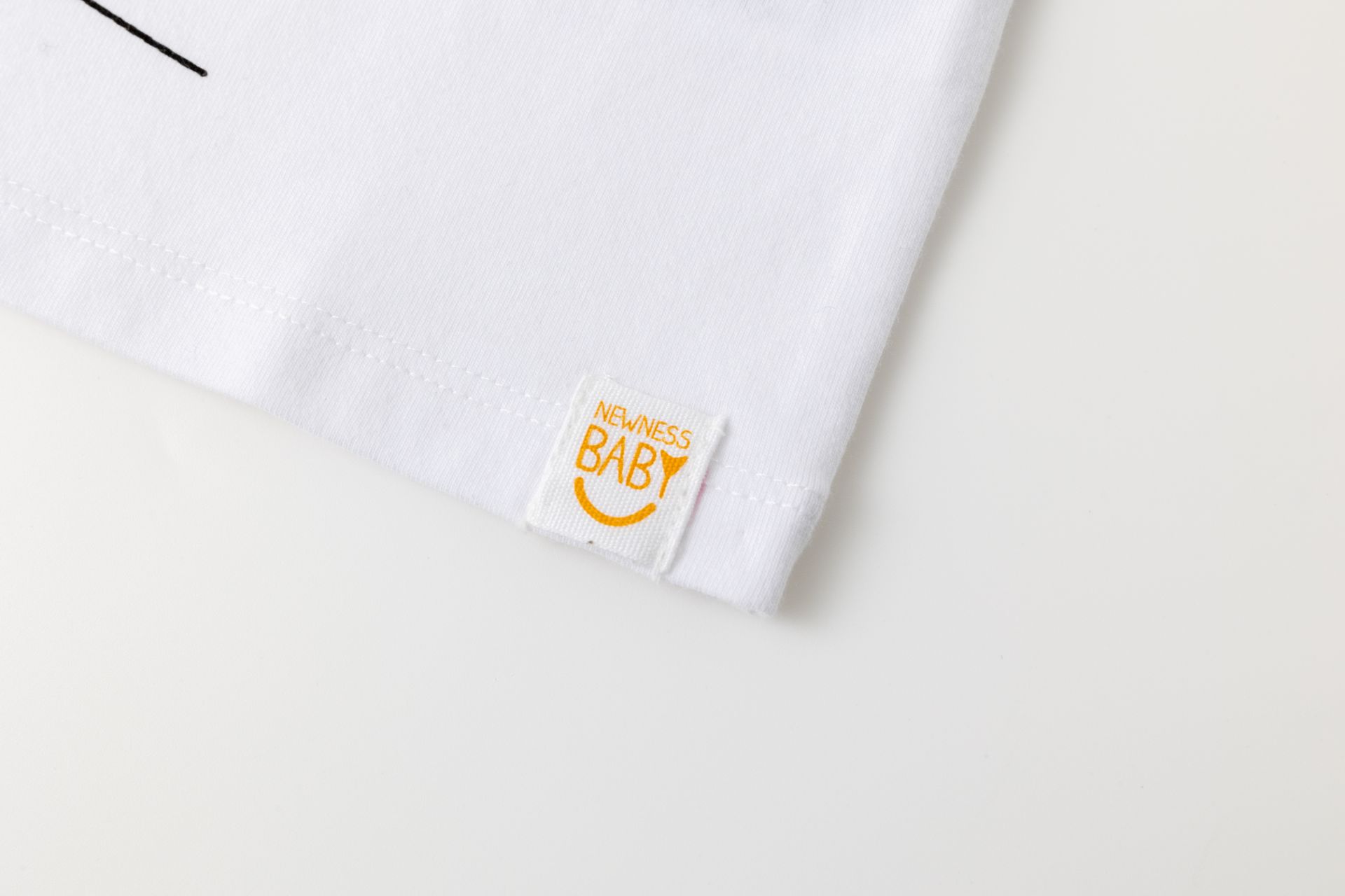 Camiseta de bebé niño en single jersey de manga corta y cuello a la caja. Abertura en hombro con corchetes. Etiqueta de tela bordada en bajo y estampado al agua en centro de la prenda.