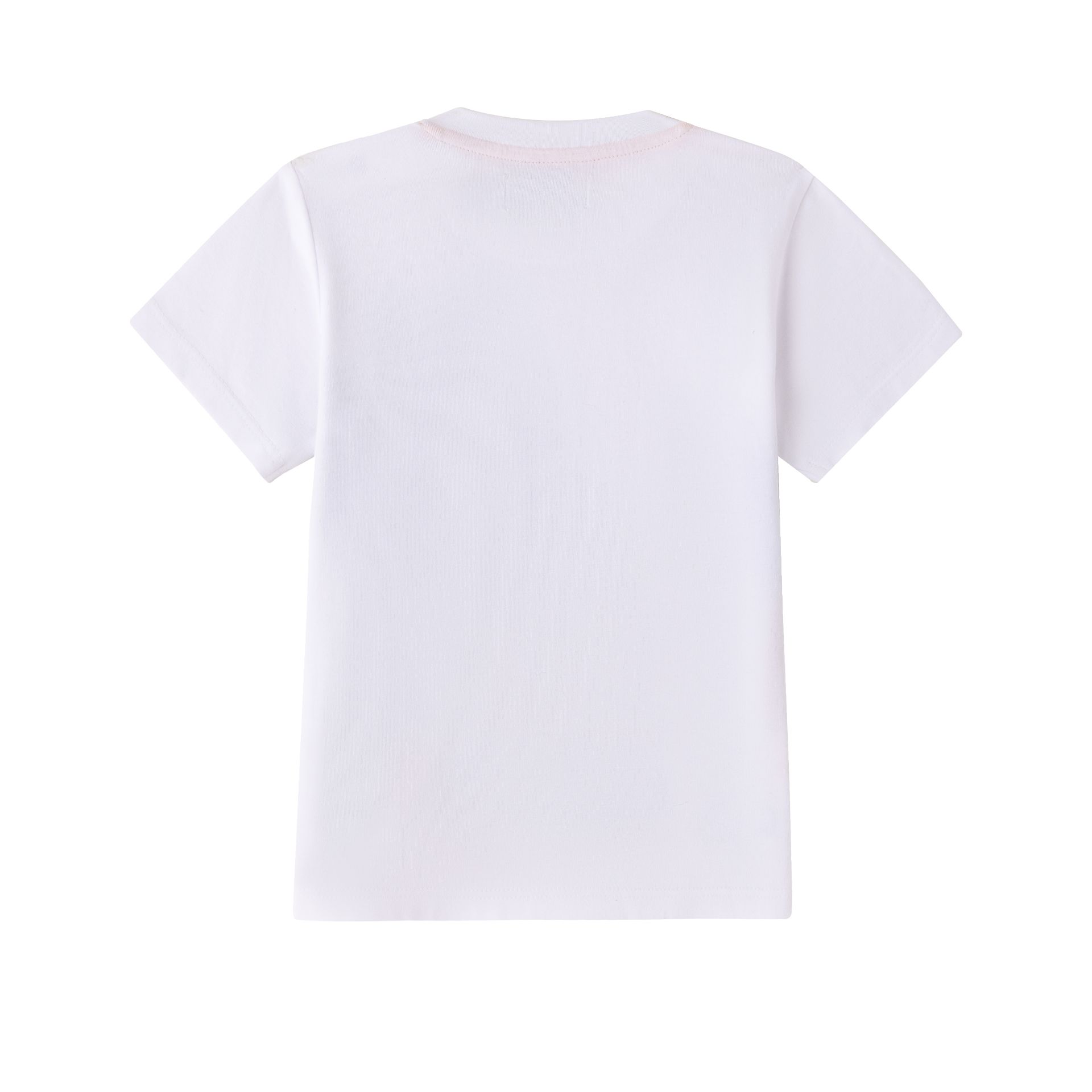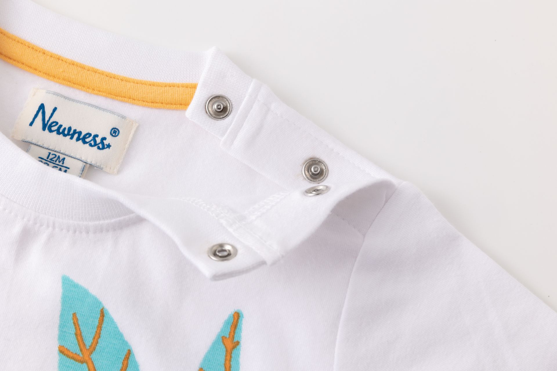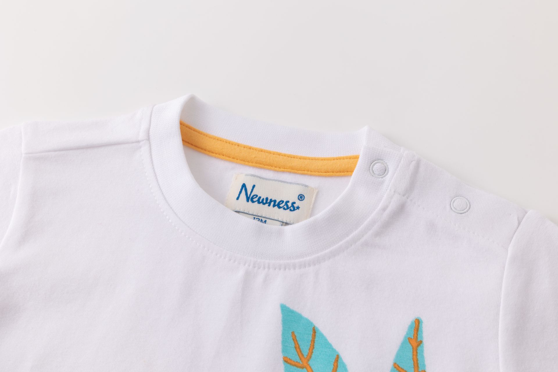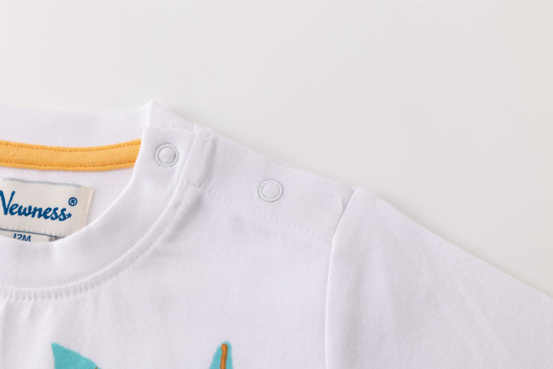 Camiseta bebé niño de manga corta y cuello a la caja. Abertura de corchetes en hombro. Con estampado al agua en delantero.
