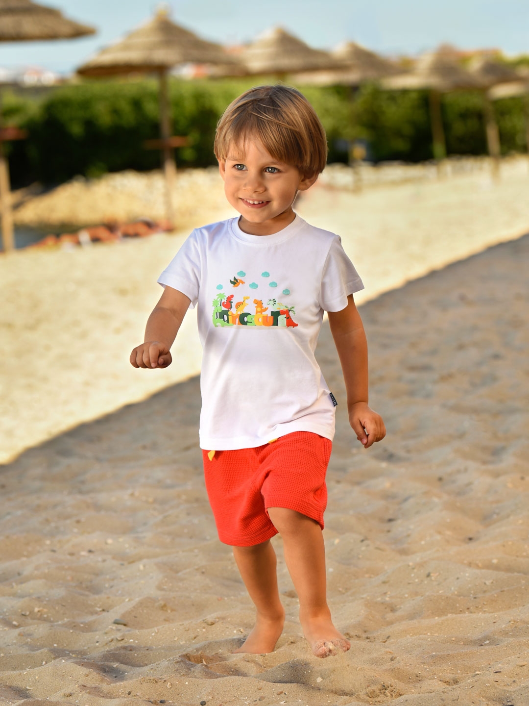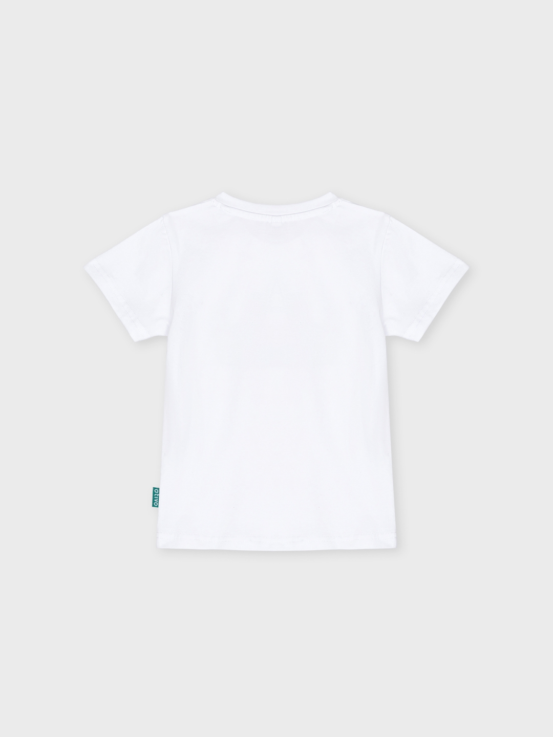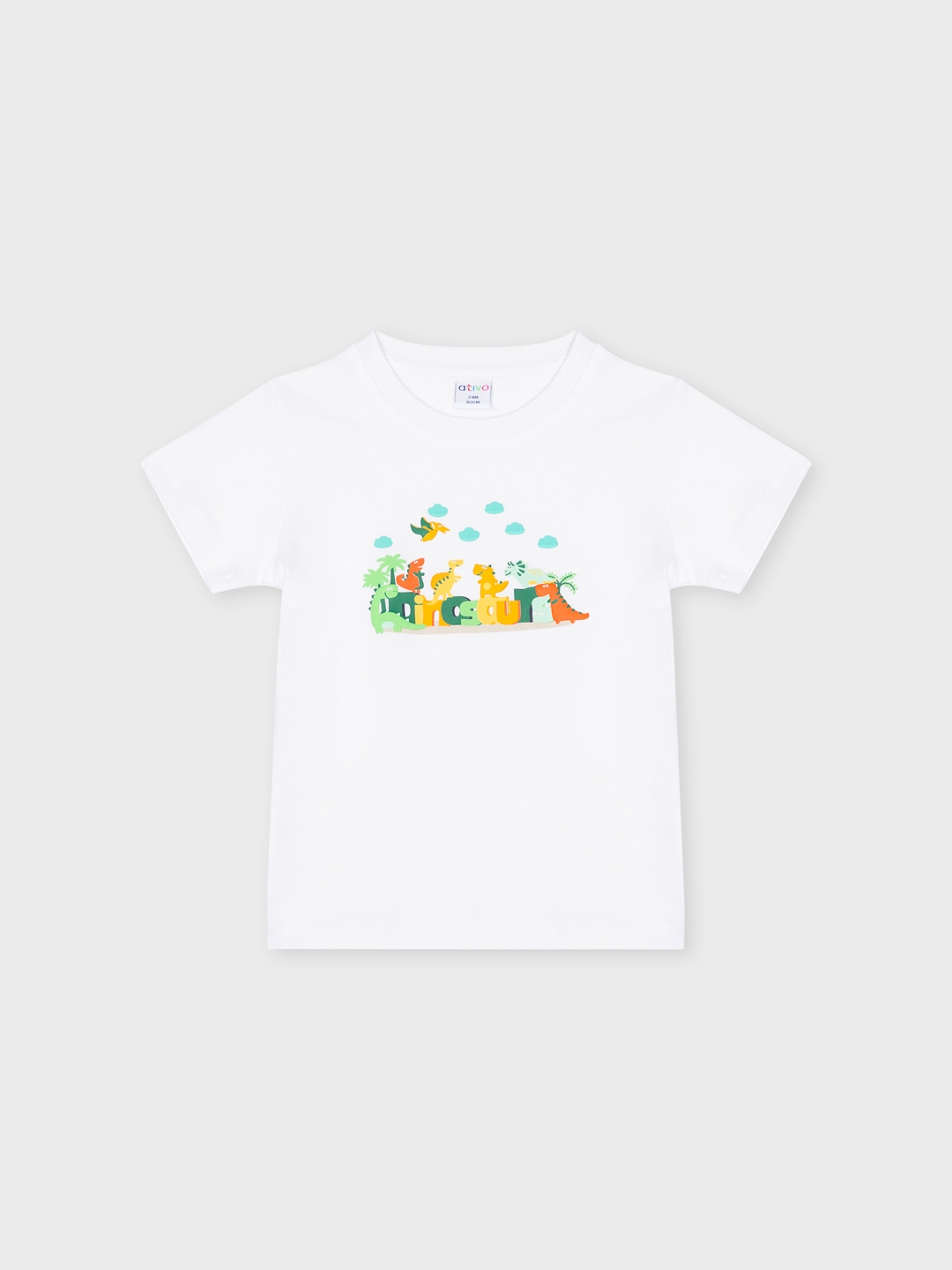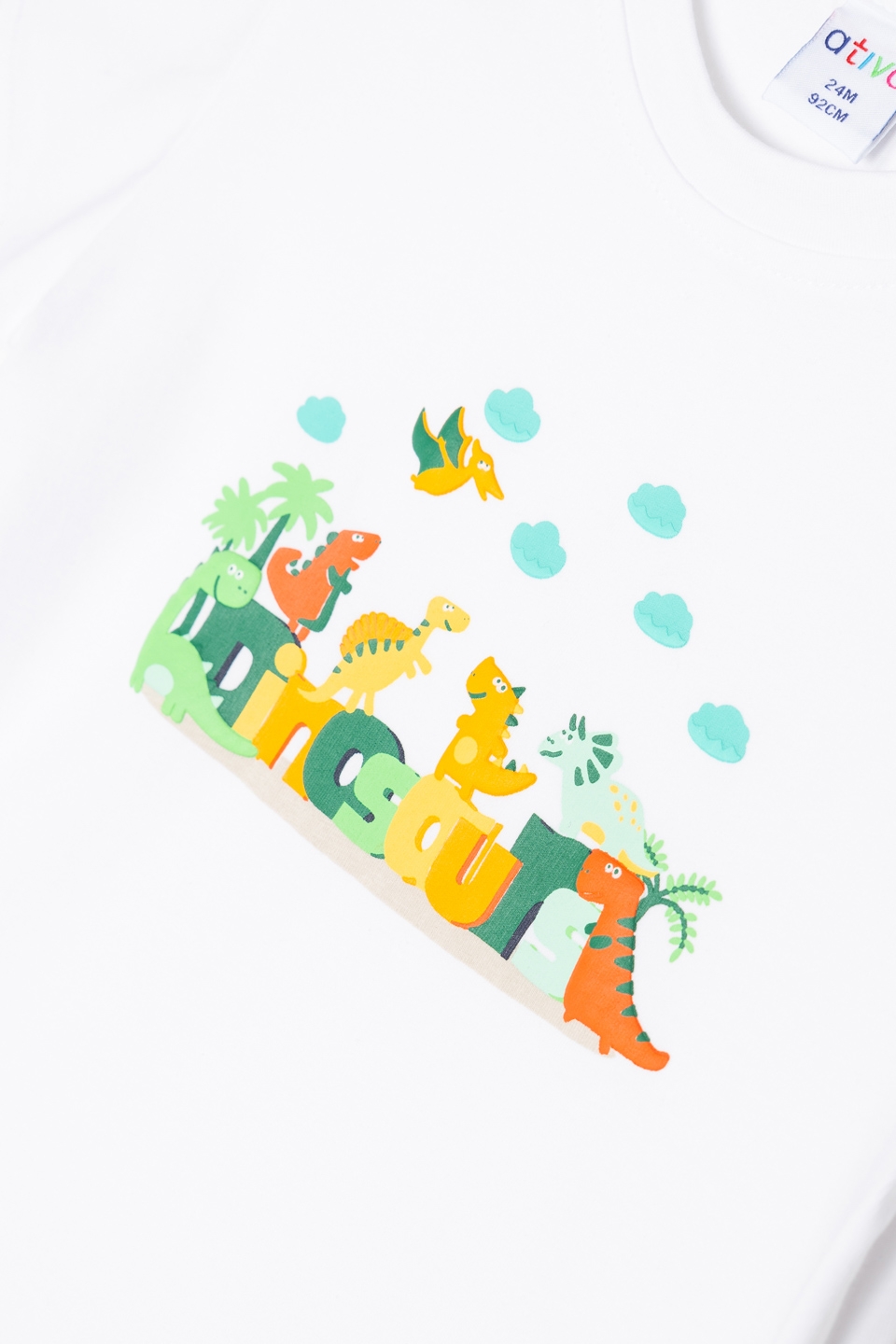 Camiseta blanca de manga corta para bebé niño con estampado frontal ‘Dinosaurios’.