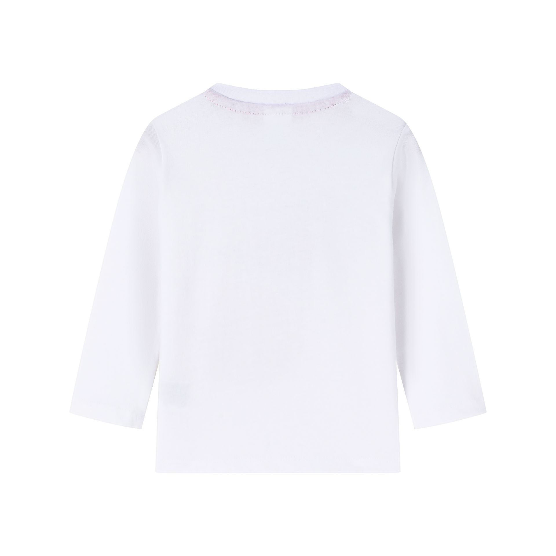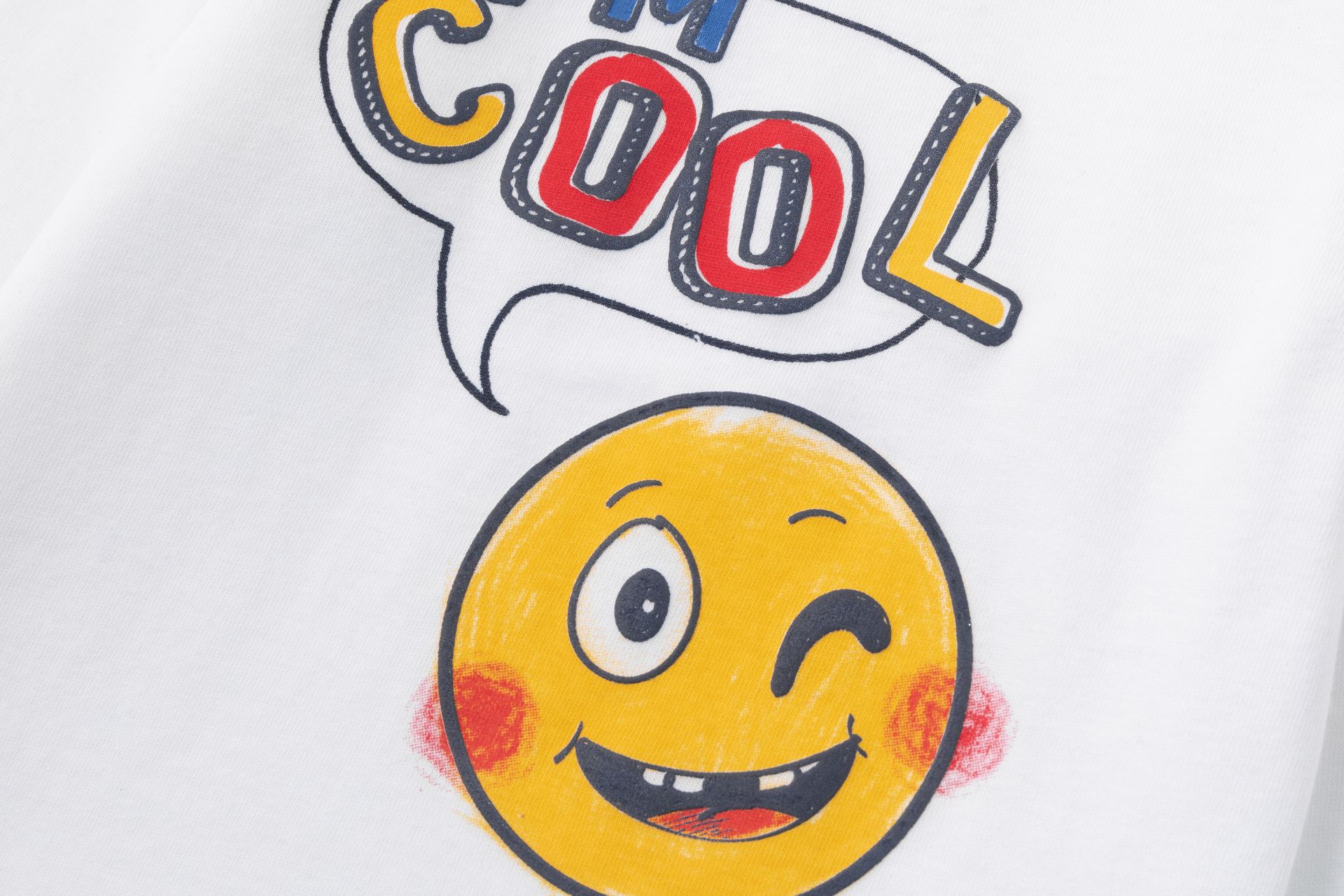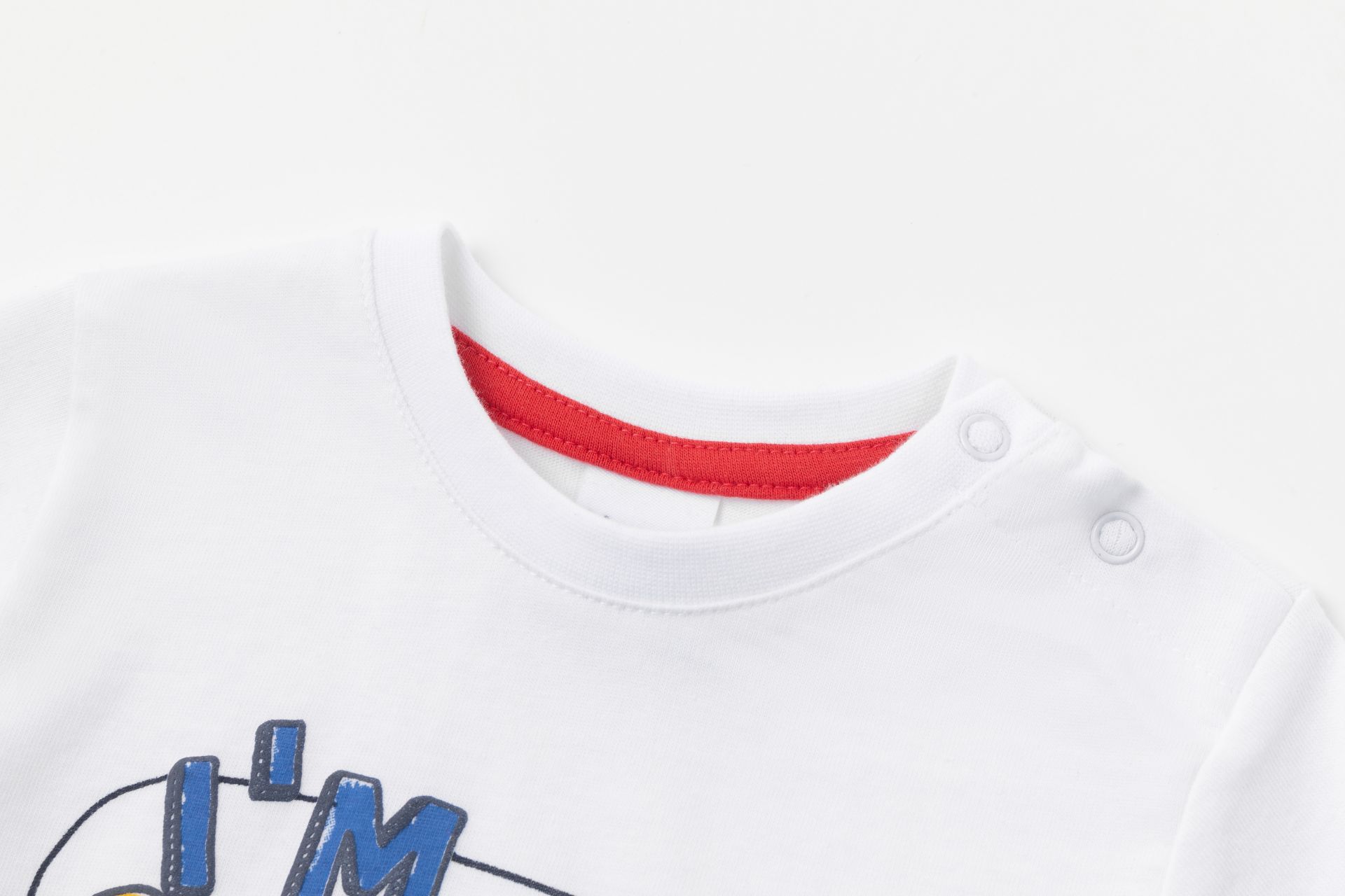 Camiseta de manga larga bebe niño y cuello caja. Gráfico central con letras y carita. Prenda en color blanco.