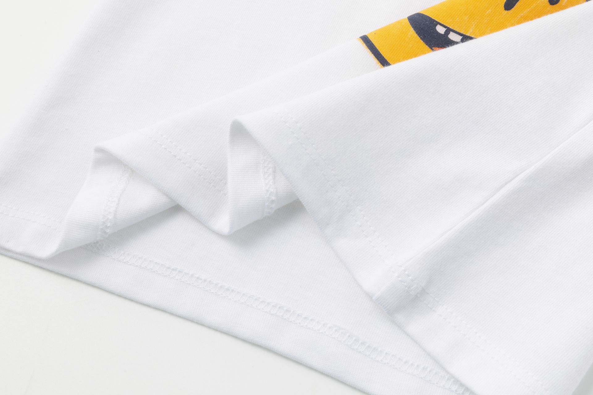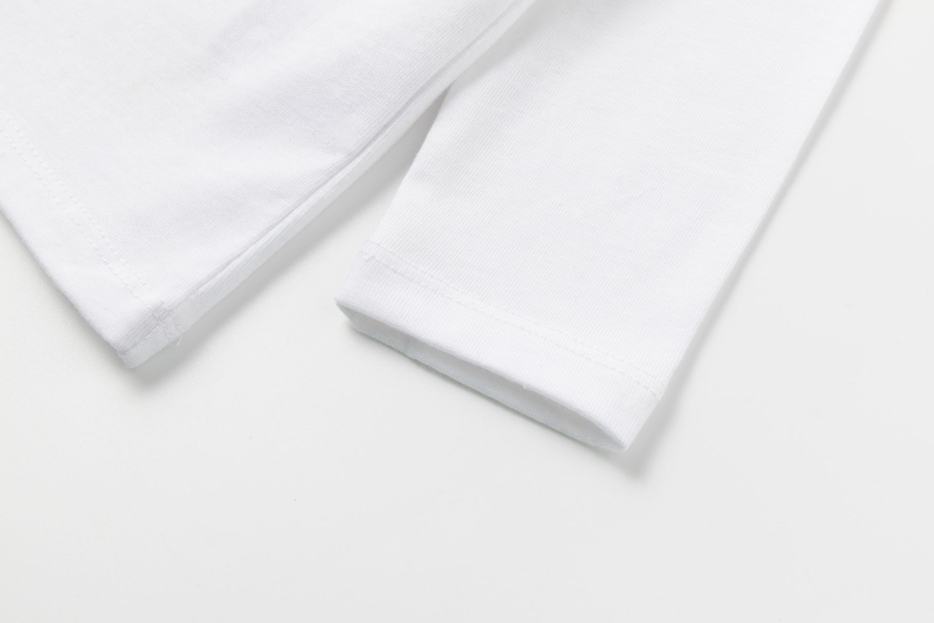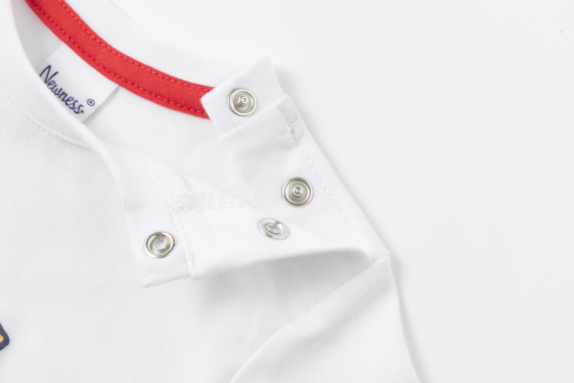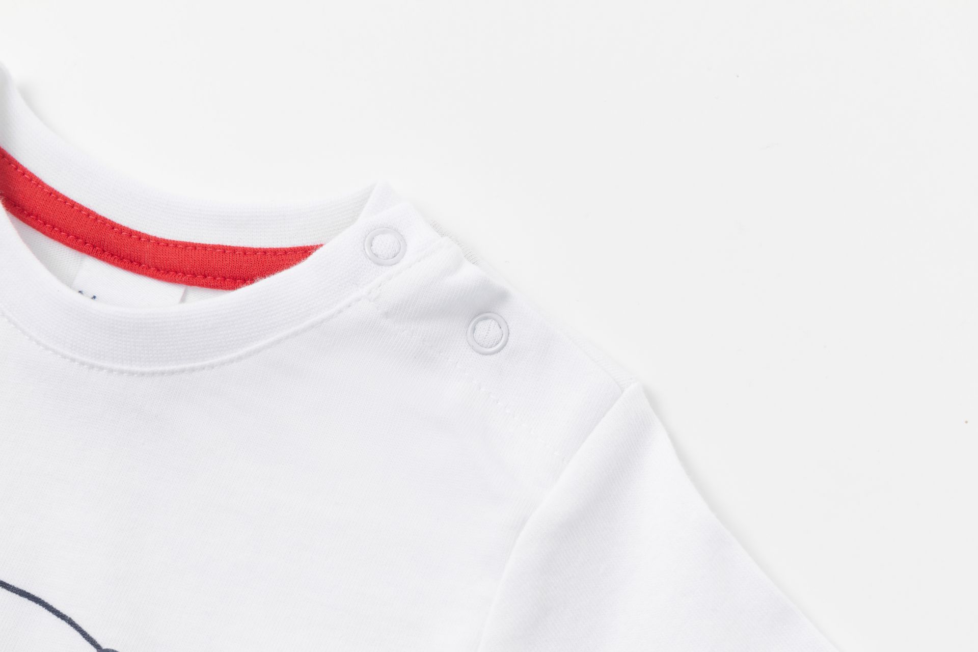 Camiseta de manga larga bebe niño y cuello caja. Gráfico central con letras y carita. Prenda en color blanco.