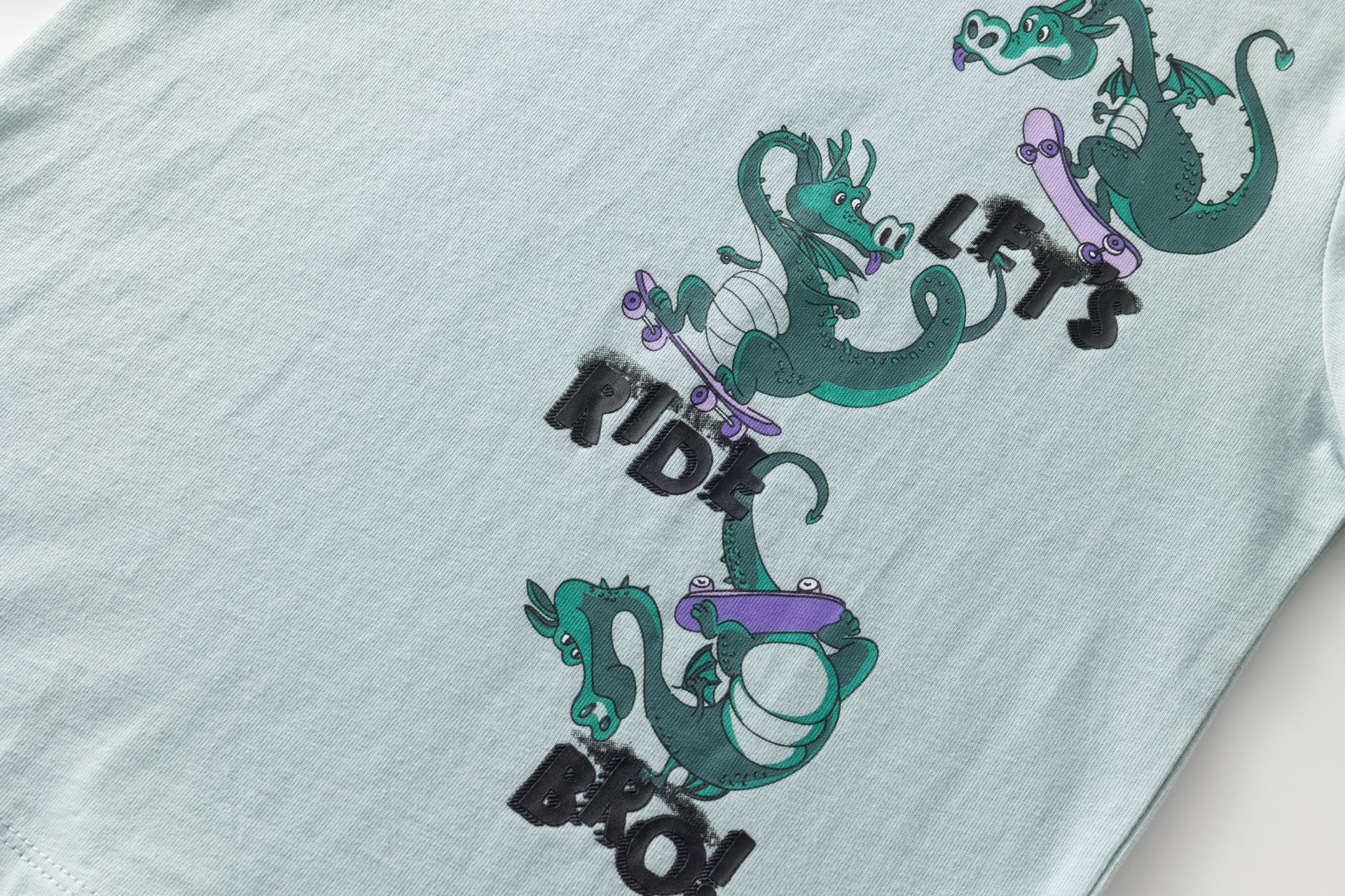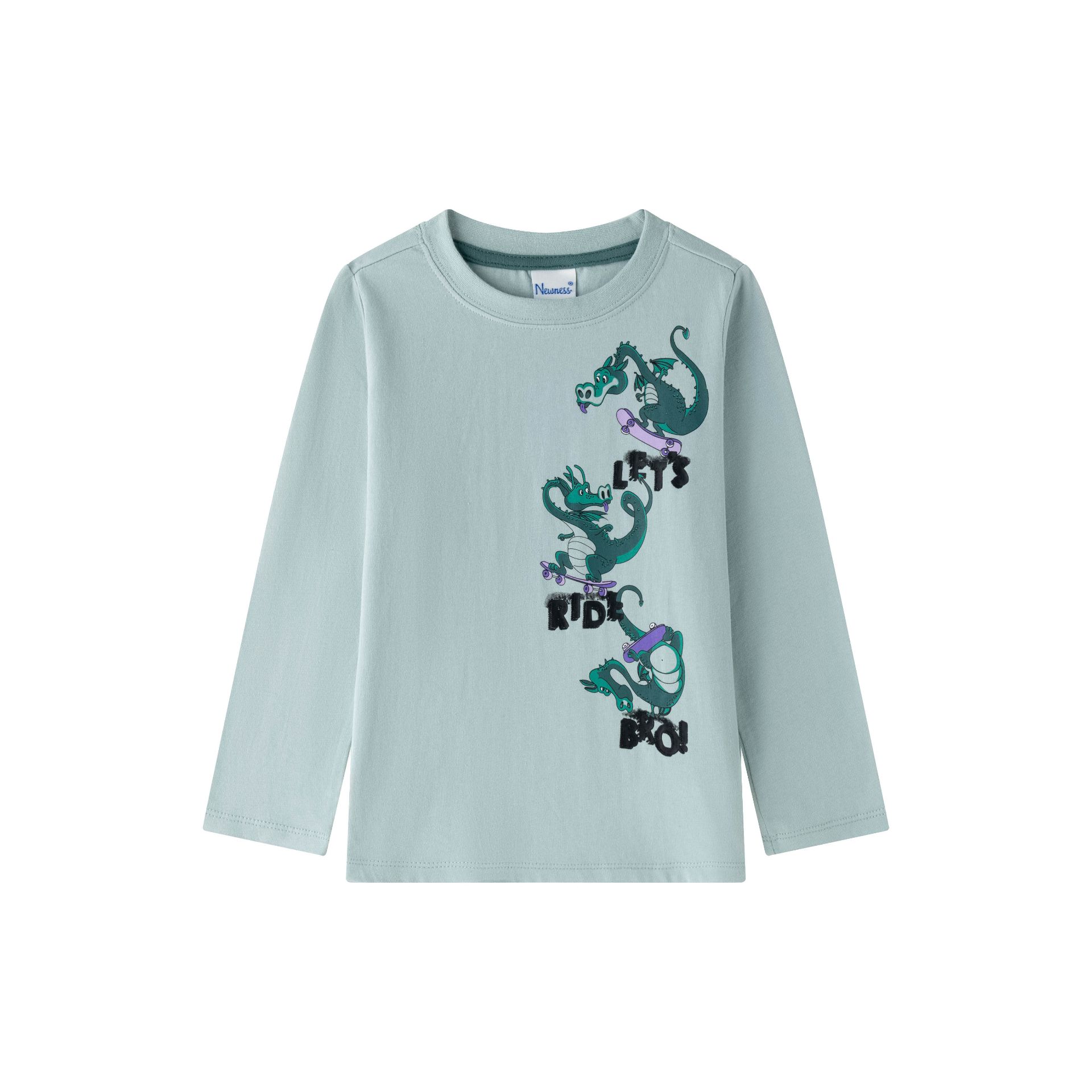 Camiseta manga larga de niño. Con gráfico de dragones estampado al agua y detalles en alta densidad.