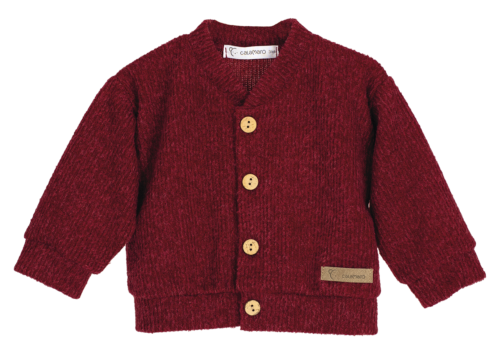Esta chaqueta en rojo burdeos es pura ternura envuelta en punto grueso. Con sus cinco botoncitos de madera que parecen galletitas mini, está listo para convertir a cualquier bebé en el más elegante del parque… o del sofá. Su cuello en V dice “sofisticado”, pero sus manguitas gorditas gritan “abrázame”. Y esa etiqueta de “Calamaro” en la esquina le da el toque final, como si dijera: “Sí, soy de marca, pero sigo siendo adorable”. Ideal para tardes frías, sesiones de fotos o simplemente para derretir corazones. 🧶❤️