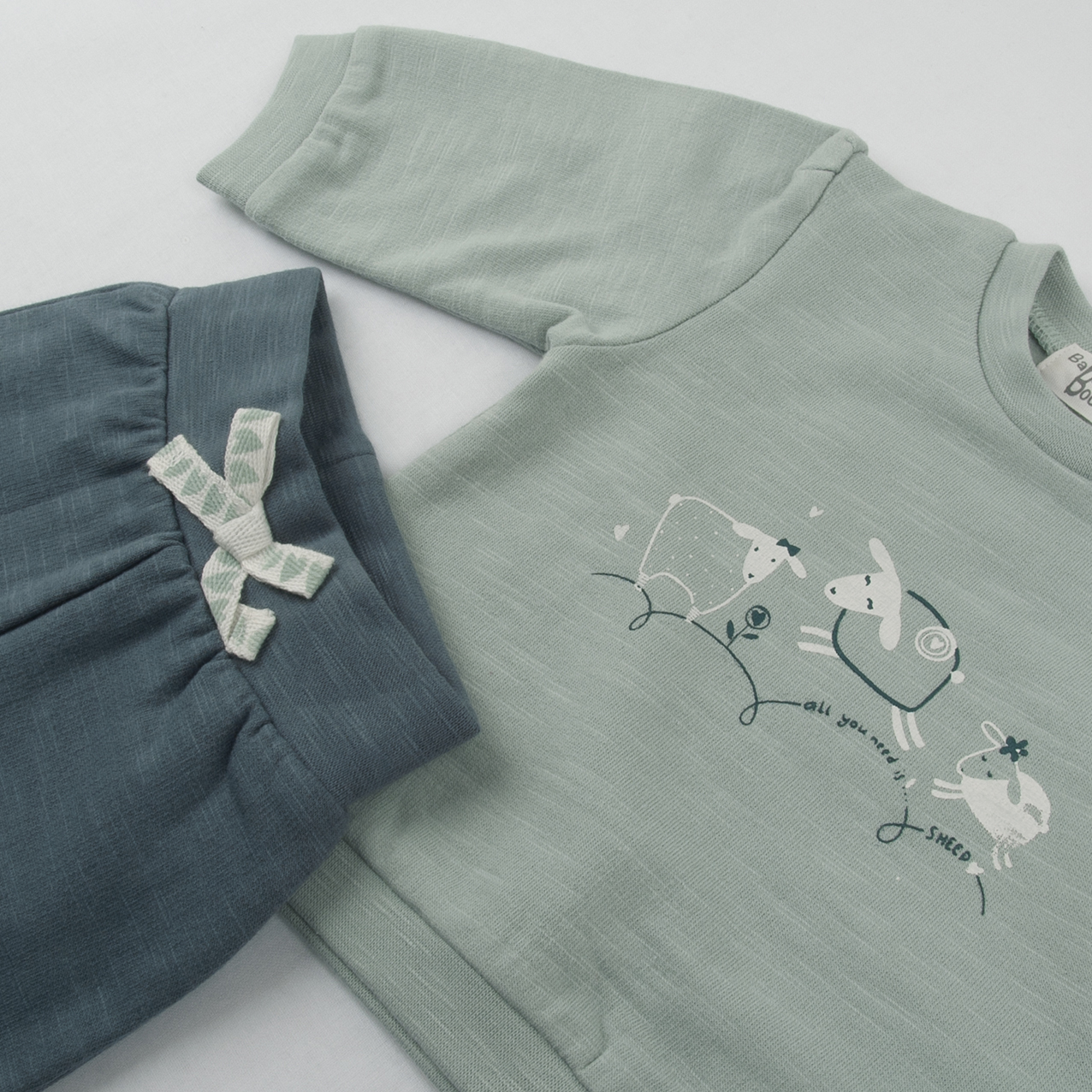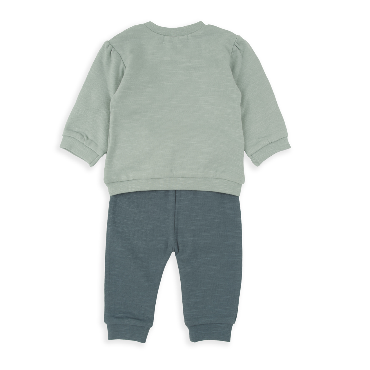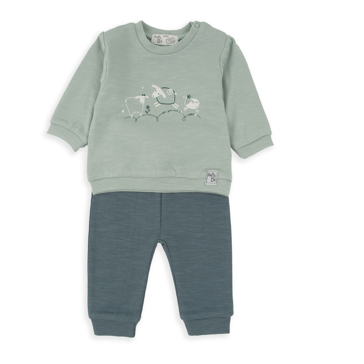 Conjunto 2 piezas ovejitas en tonos verdes oscuros y claros. Sudadera cerrada con corchetes de cierre y abertura en la parte del hombre de la sudadera. Pantalón con lazo decorativo, cintura y puños de goma elástica. Interior afelpado.