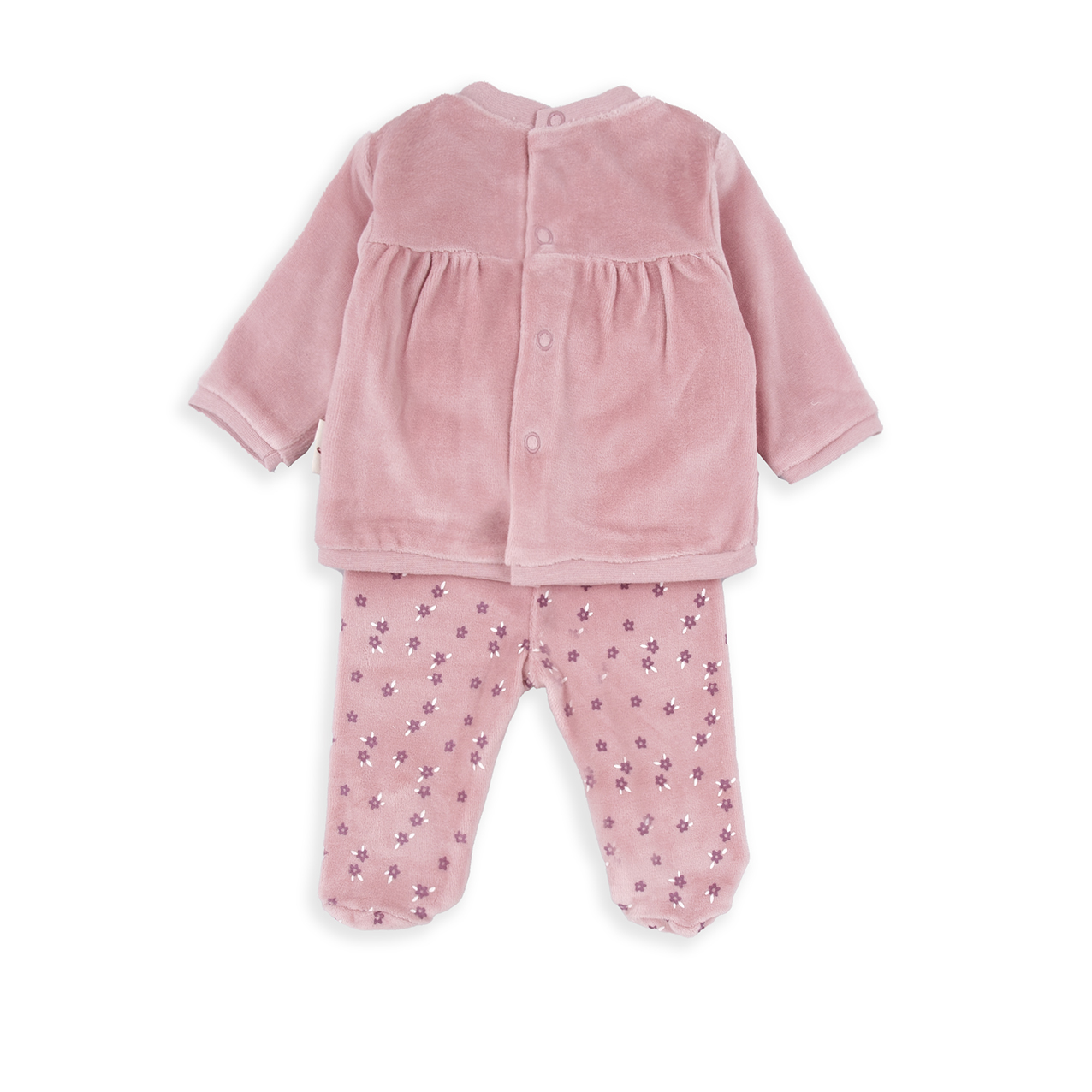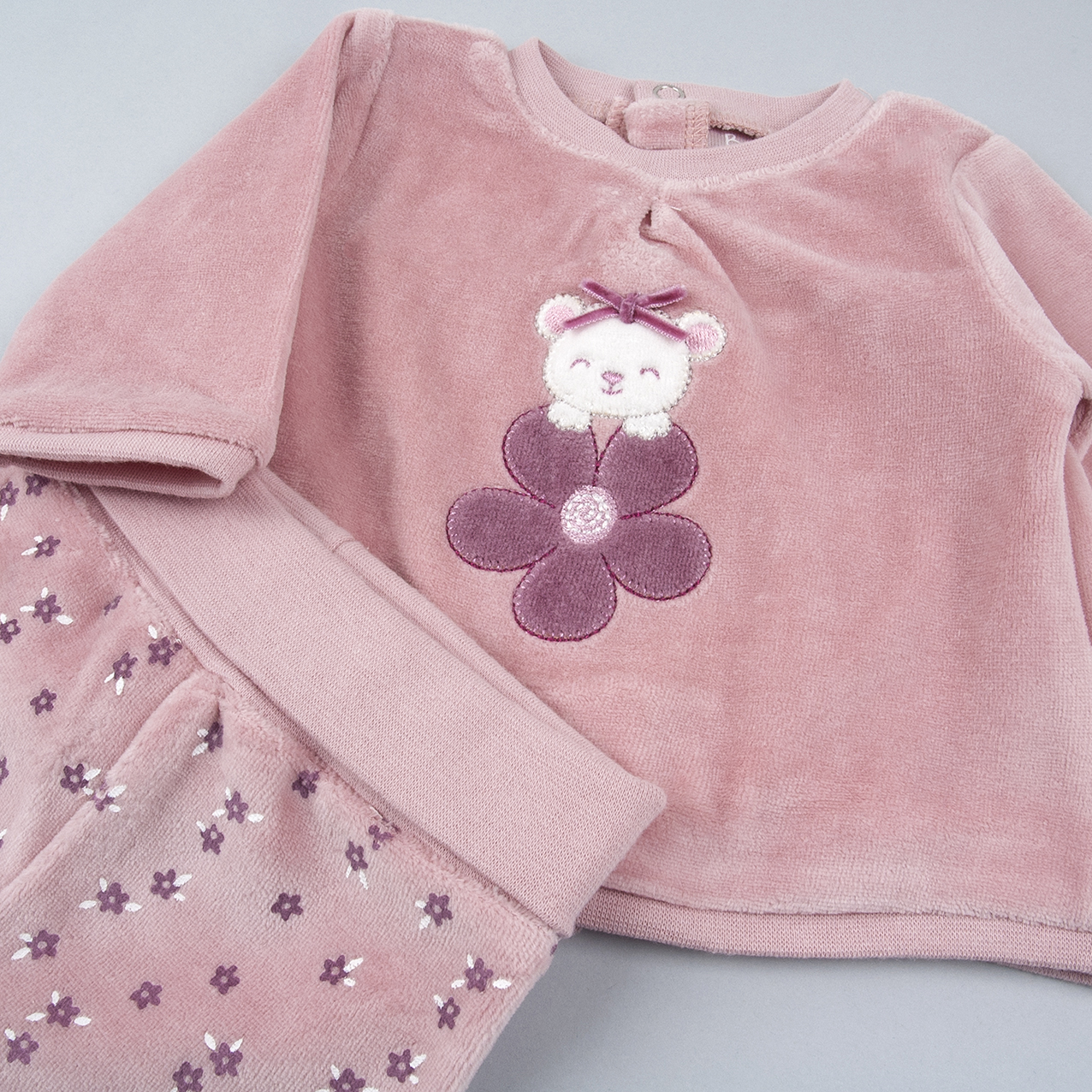 Conjunto de polaina con tejido aterciopelado, estampado con un osito con flor en tonos malvas claros y oscuros.