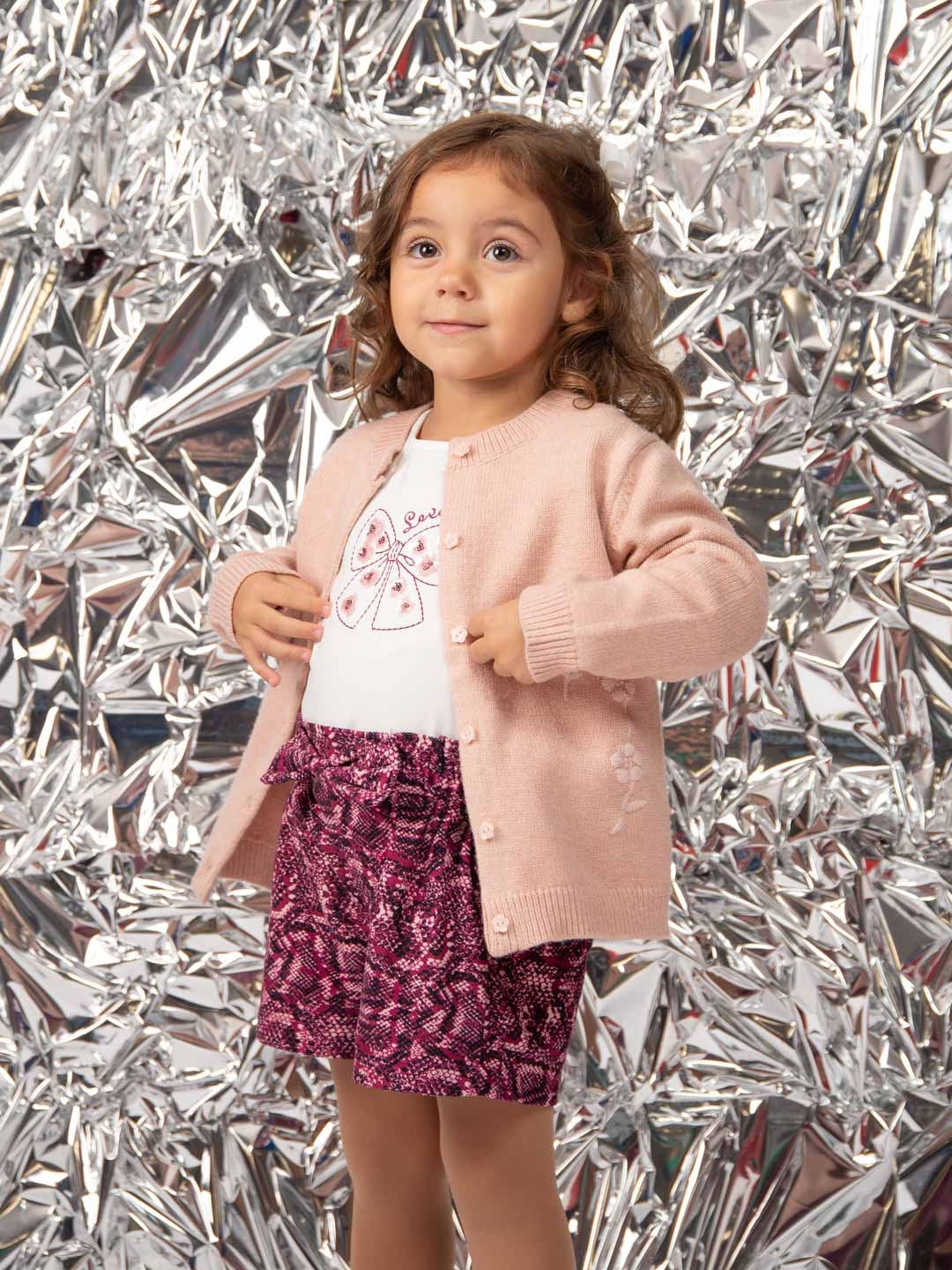Este outfit combina una blusa blanca de manga larga, suave como una nube y decorada con un tierno lazo estampado, con unos shorts de tejido ligero en un vibrante tono fucsia estampado. Perfecto para jugar, pasear o conquistar el día con una sonrisa.