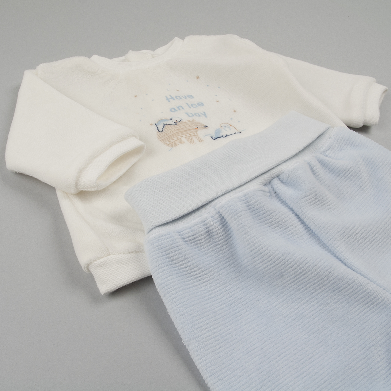 Conjunto para bebé en dos piezas de terciopelo. Modelo con camiseta y polaina confeccionadas en terciopelo de algodón con print delantero. Pantalón liso con pies.