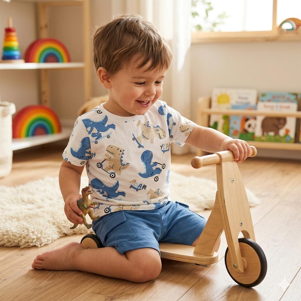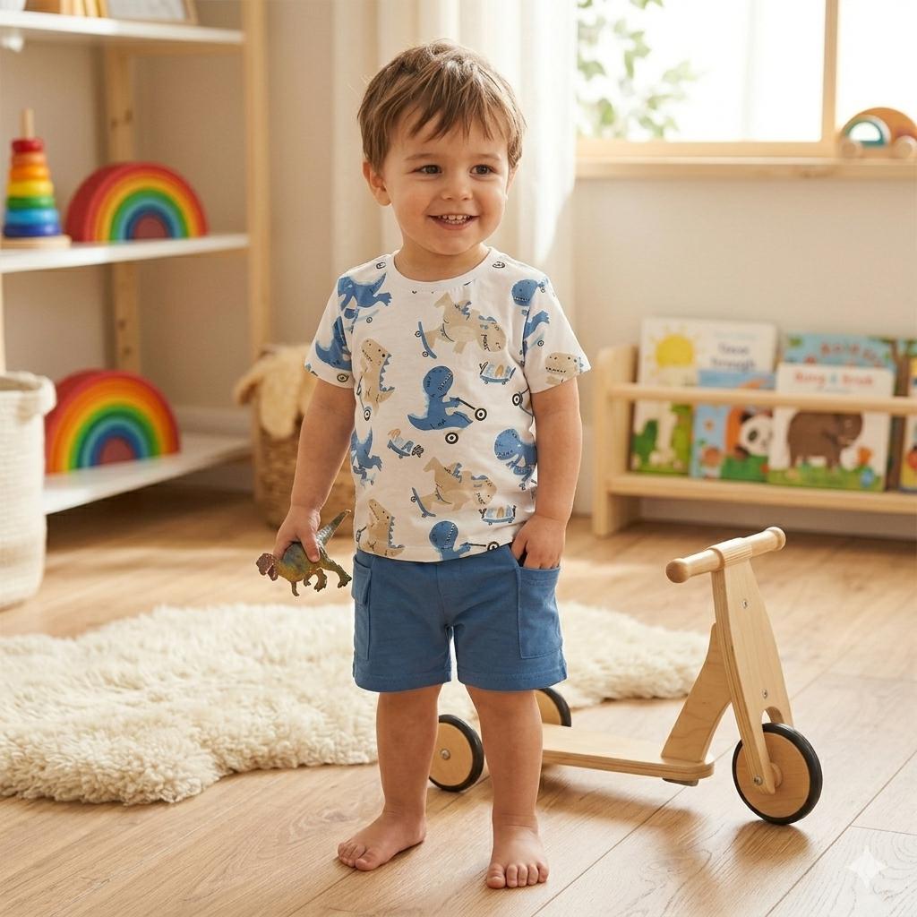 Este look es perfecto para una tarde en el parque, una fiesta de cumpleaños o simplemente para jugar en casa. El diseño de dinosaurios en tonos azul y beige permite combinar las piezas fácilmente con otros básicos del armario.