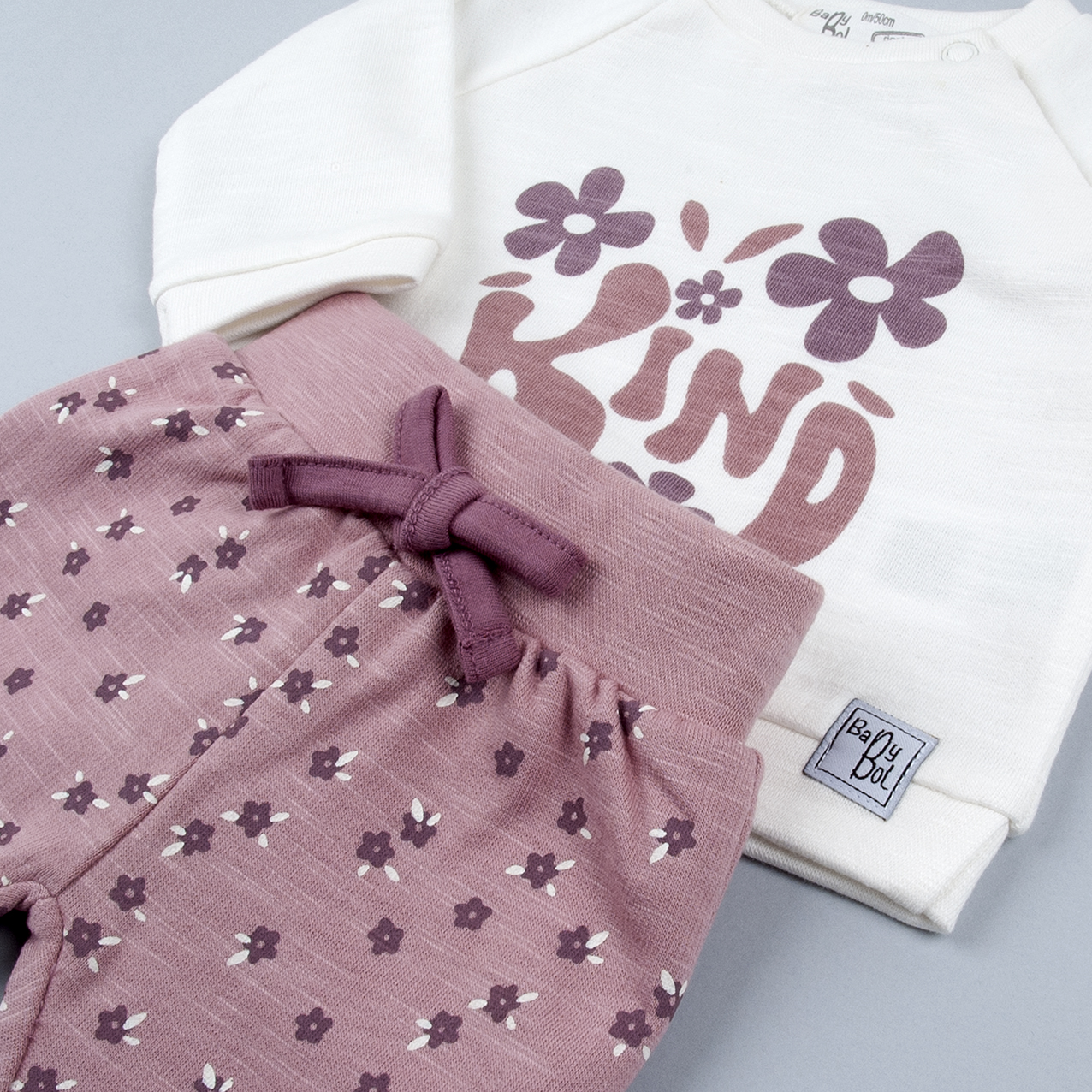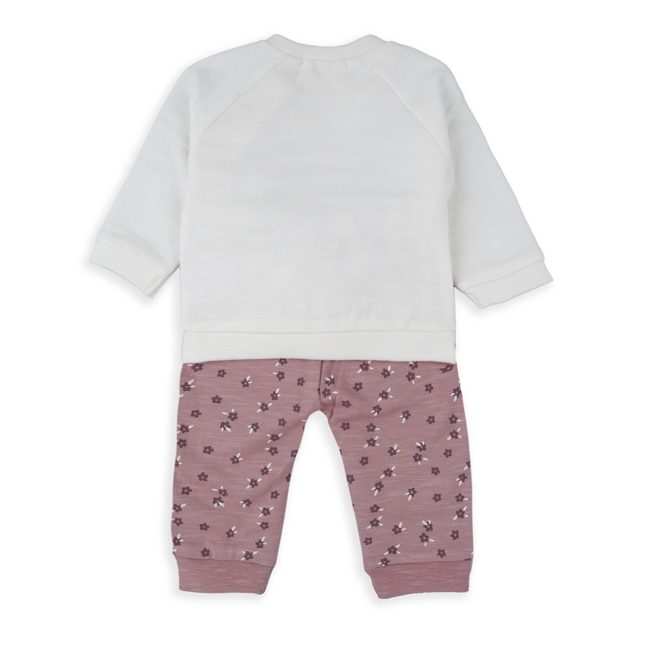 Conjunto para bebé compuesto por sudadera en color crudo cerrada con corchetes en el hombro y dibujo estampado delantero. Pantalón en color malva, estampado de flores, puño y con felpa en el interior.