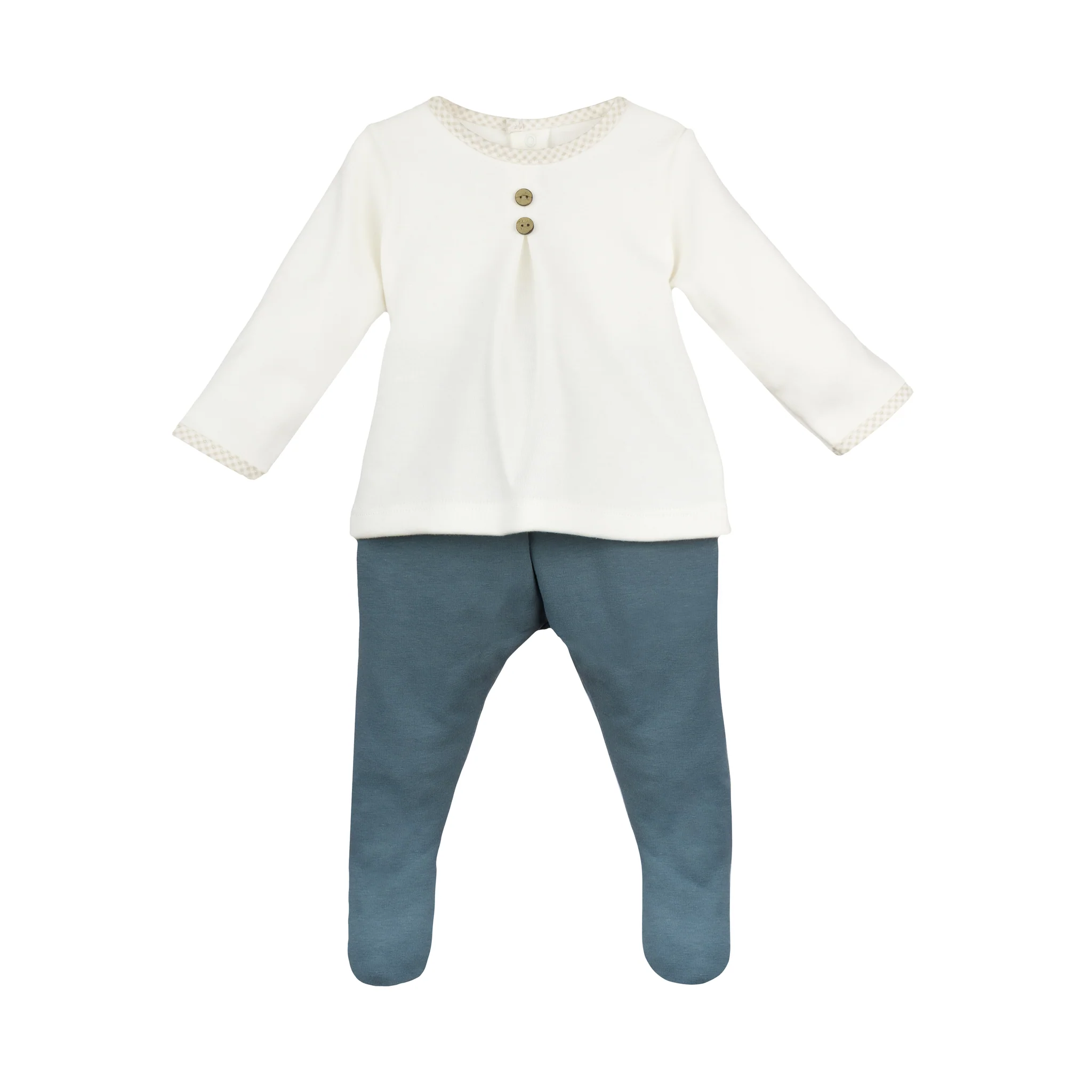 Conjunto compuesto de polaina azul y jersey blanco.