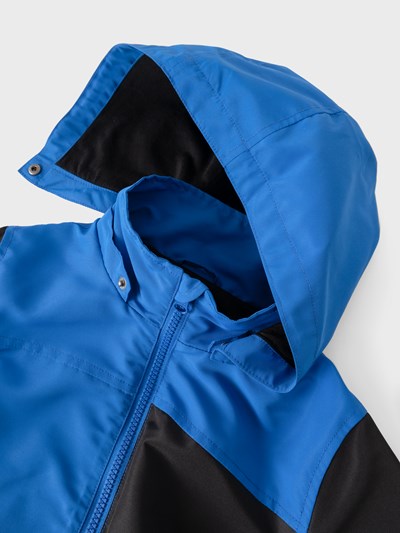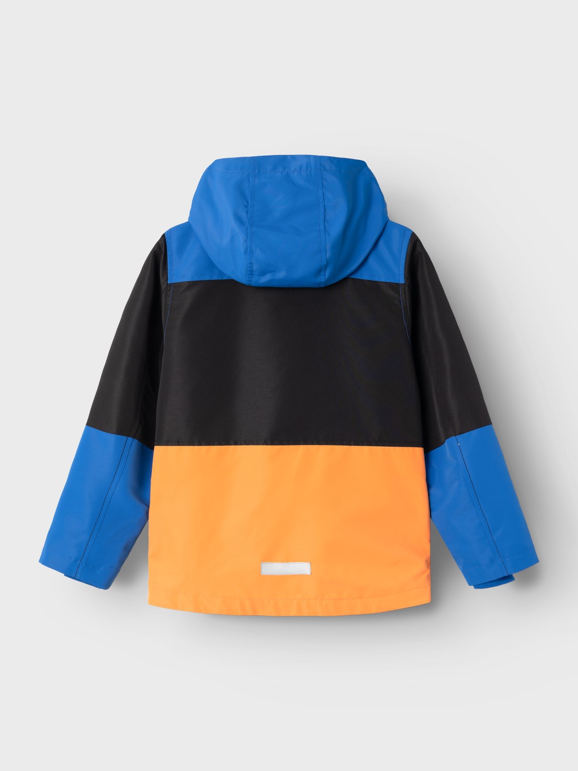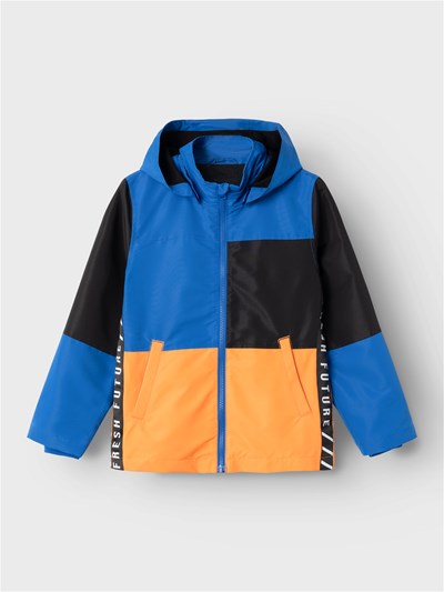 Cortavientos compuesto de tres colores, azul, negro y naranja. Tiene capucha desmontable. Bolsillos delanteros funcionales.