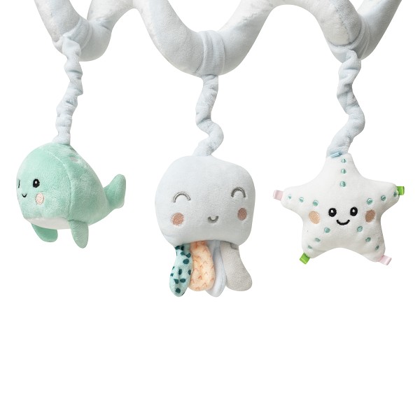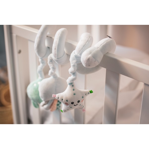 Suaves figuras con sonajero en una bonita espiral de actividades que puedes enroscarla tanto en la cuna, la hamaca o en el carrito.