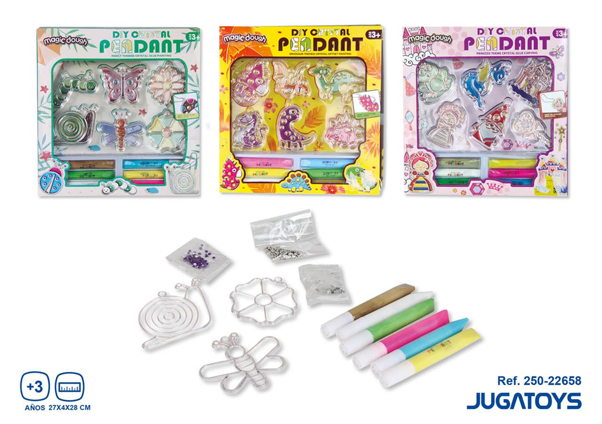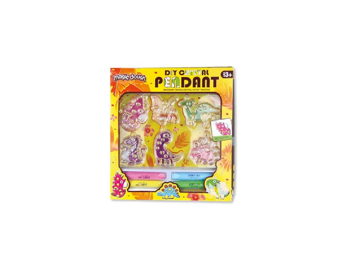El kit Magic Dough DIY Crystal Pendant es un set creativo y educativo diseñado para niños a partir de 3 años. Este set incluye plantillas de figuras temáticas (como dinosaurios, princesas, y animales) que pueden personalizarse utilizando la técnica de pintura con pegamento cristalizado.