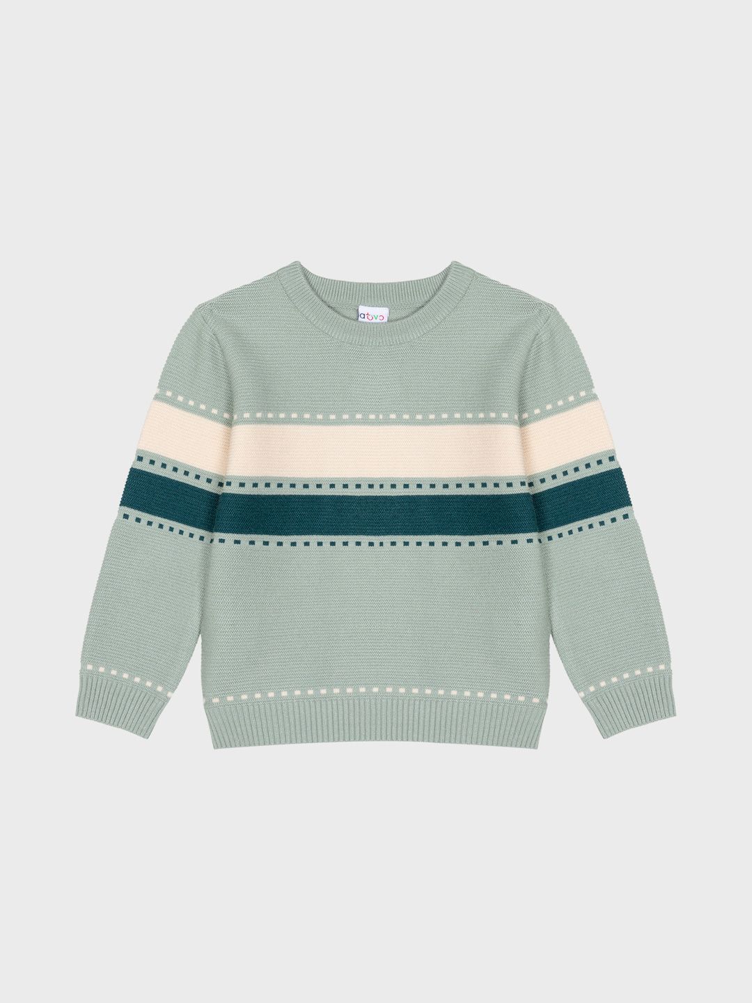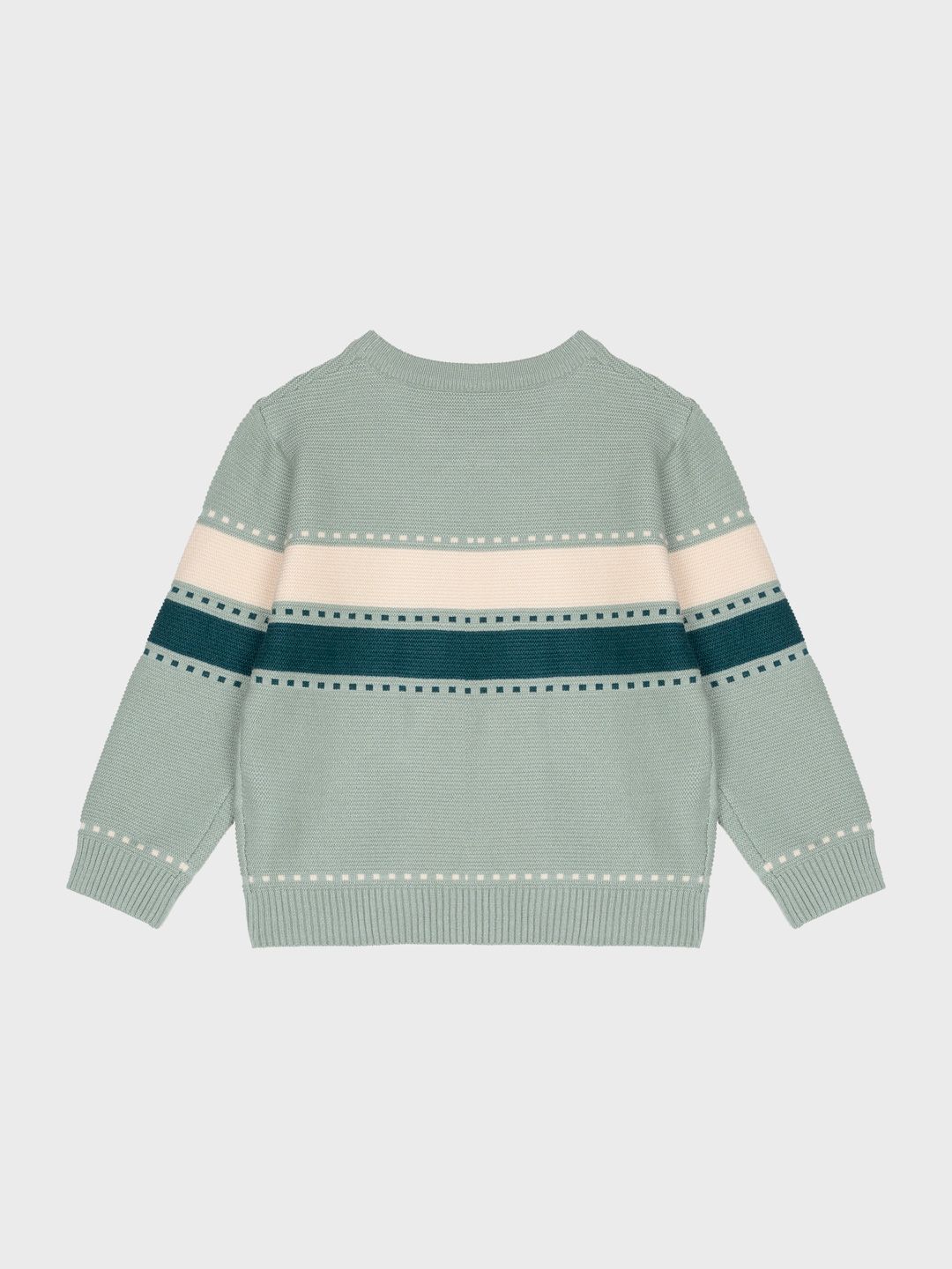 Este suéter de punto para niño es ideal para ofrecer comodidad y estilo en cualquier temporada. Con un diseño de rayas en tonos verde menta, crema y azul marino, añade un toque de color y frescura a su guardarropa. Las líneas de puntos a lo largo de las rayas le dan un detalle único y moderno, mientras que el ajuste cómodo y la textura suave lo hacen perfecto para todo el día.