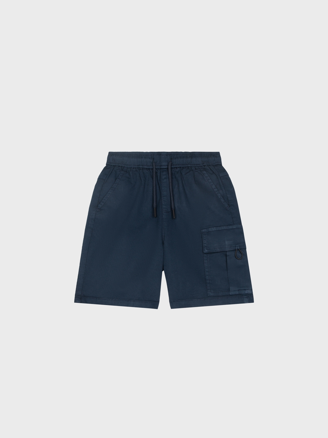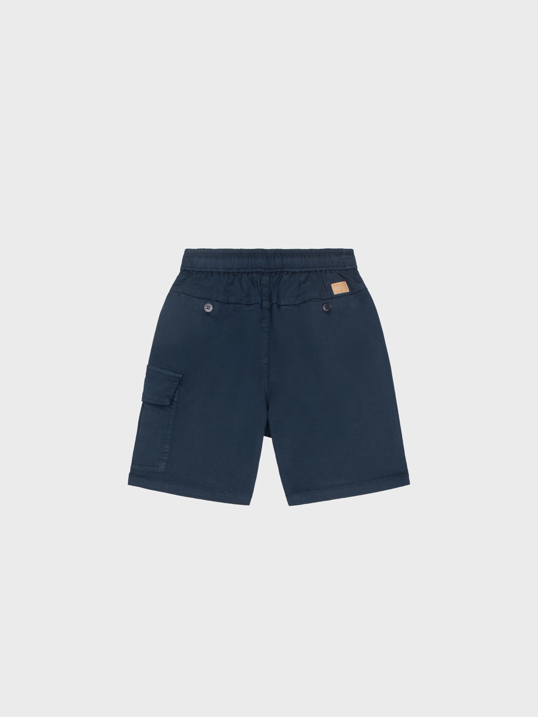 Shorts de sarga azul marino con cintura ajustable, cierre con botones frontales y bolsillo lateral. Pantalones cortos cómodos para niños.