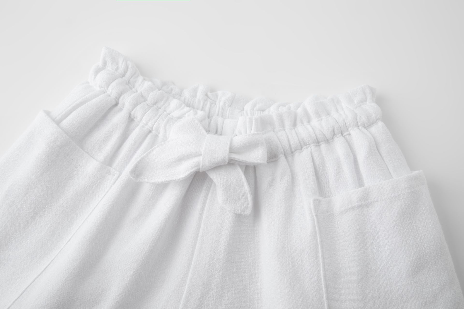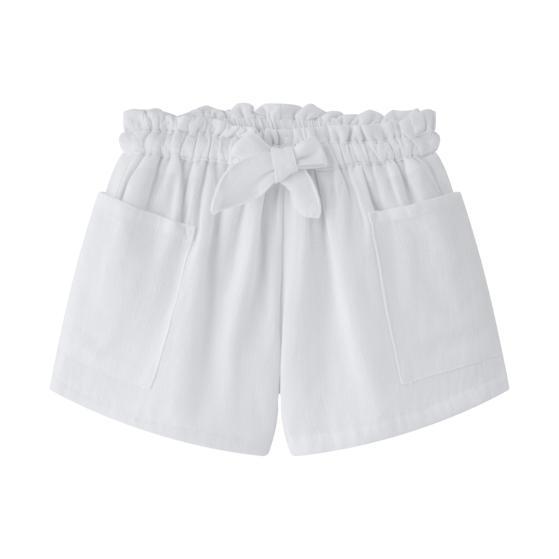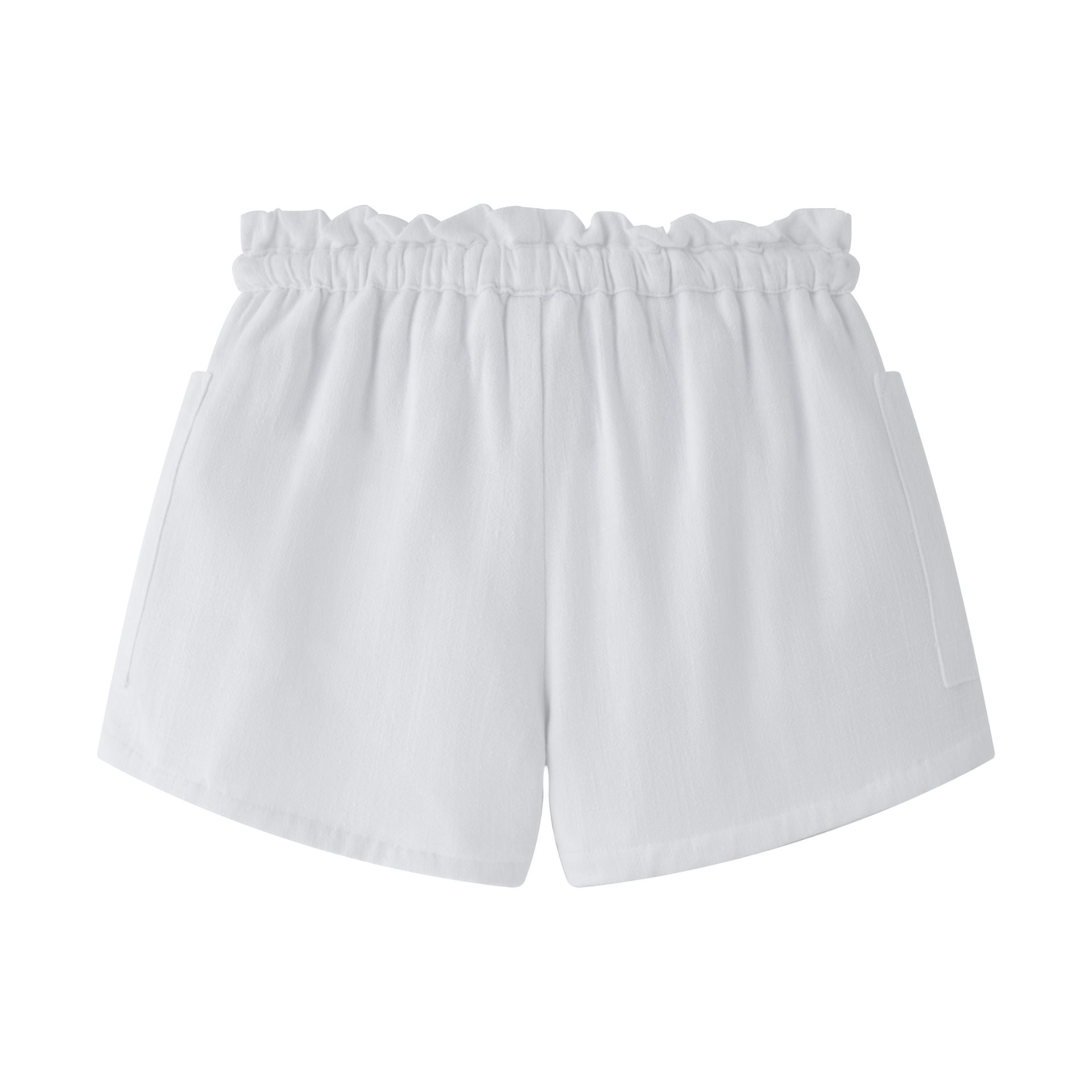 Pantalón short de chica, con cordón en cintura a tono. Bolsillos parche en costados. En tejido de viscosa y lino, color blanco liso.