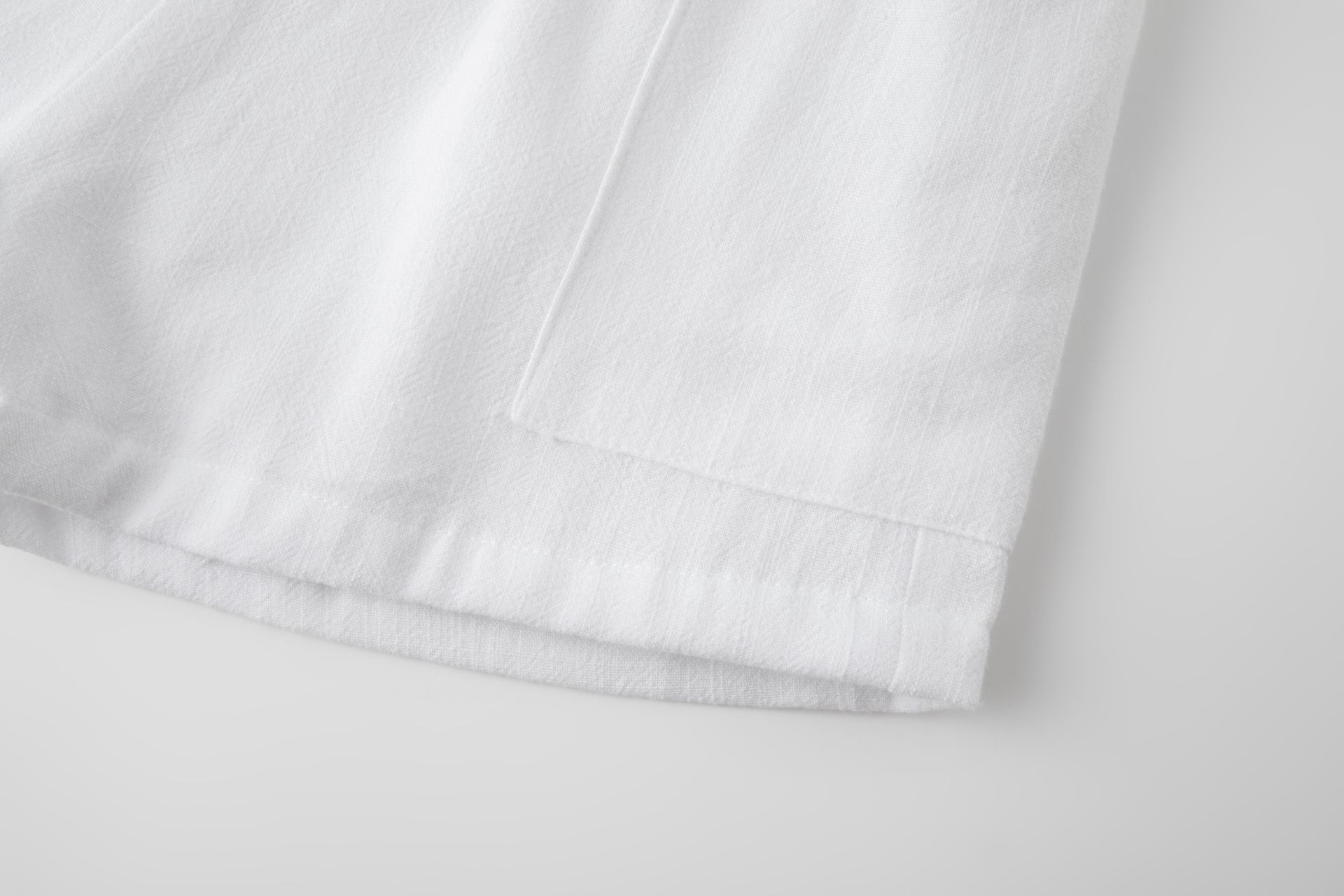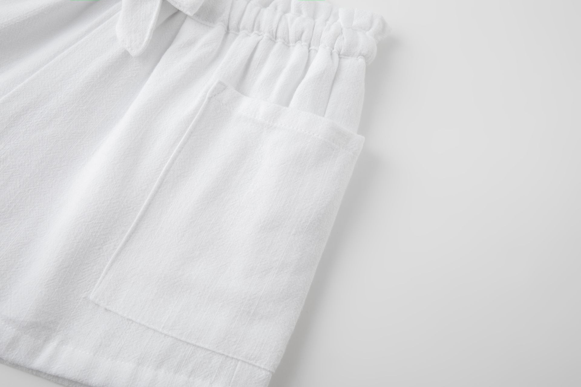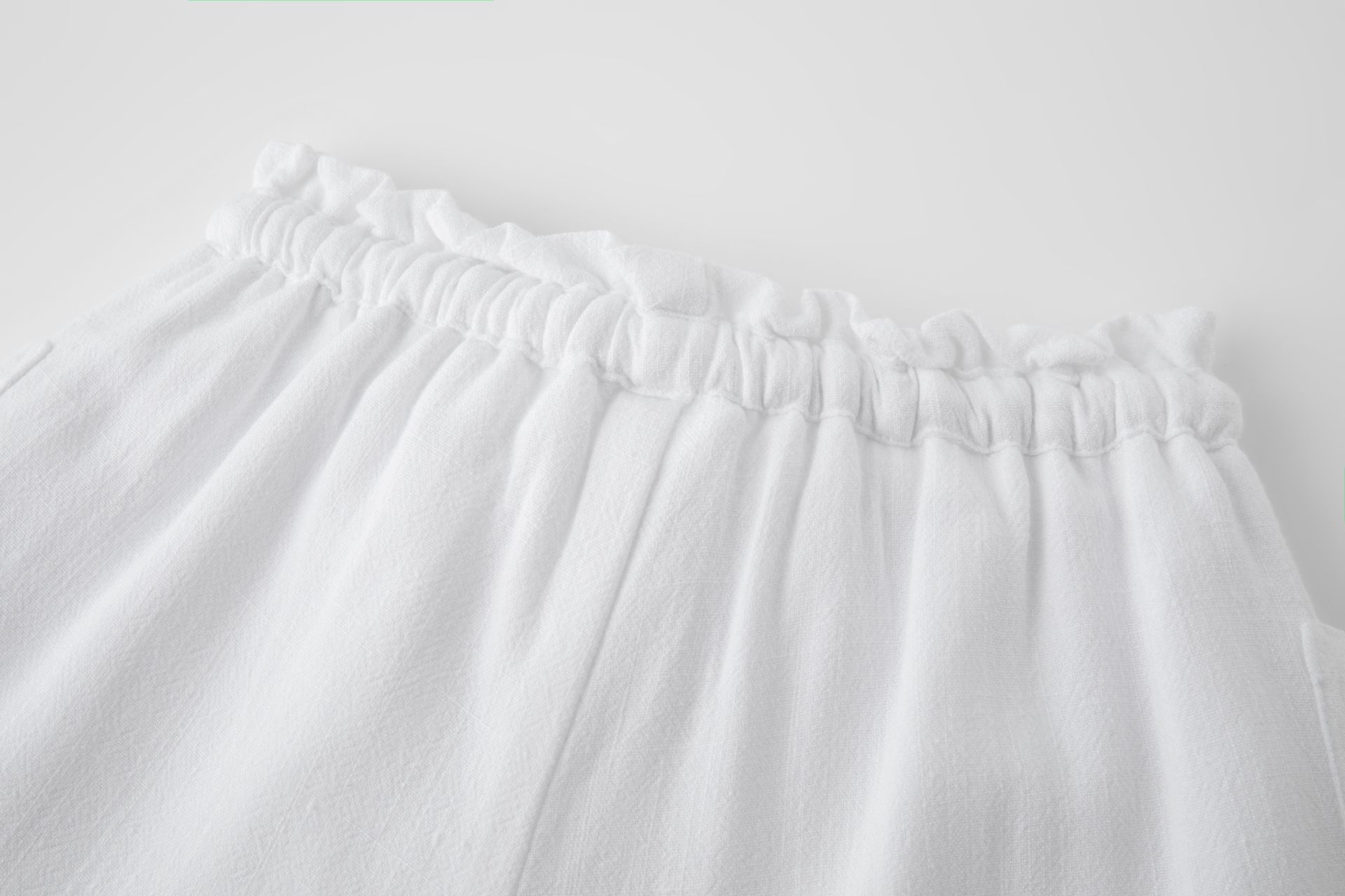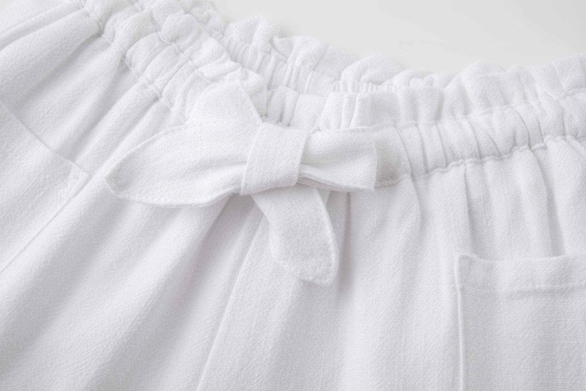 Pantalón short de chica, con cordón en cintura a tono. Bolsillos parche en costados. En tejido de viscosa y lino, color blanco liso.