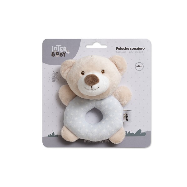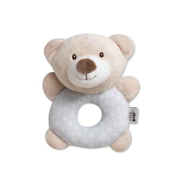 El osito sostiene un anillo de tela azul con pequeños puntos blancos, ideal para las manitas pequeñas que están descubriendo el mundo. ¡Un abrazo de peluche para cada sonrisa!