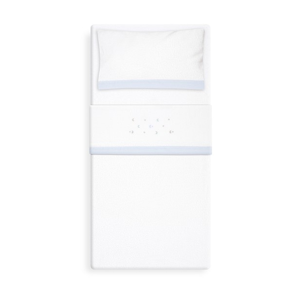 Dale a tu bebé una noche de descanso celestial con este delicado set de sábanas. Con un diseño sutil de lunas y estrellitas bordadas, en tonos suaves y relajantes, es perfecto para crear un ambiente sereno y dulce en la cuna.