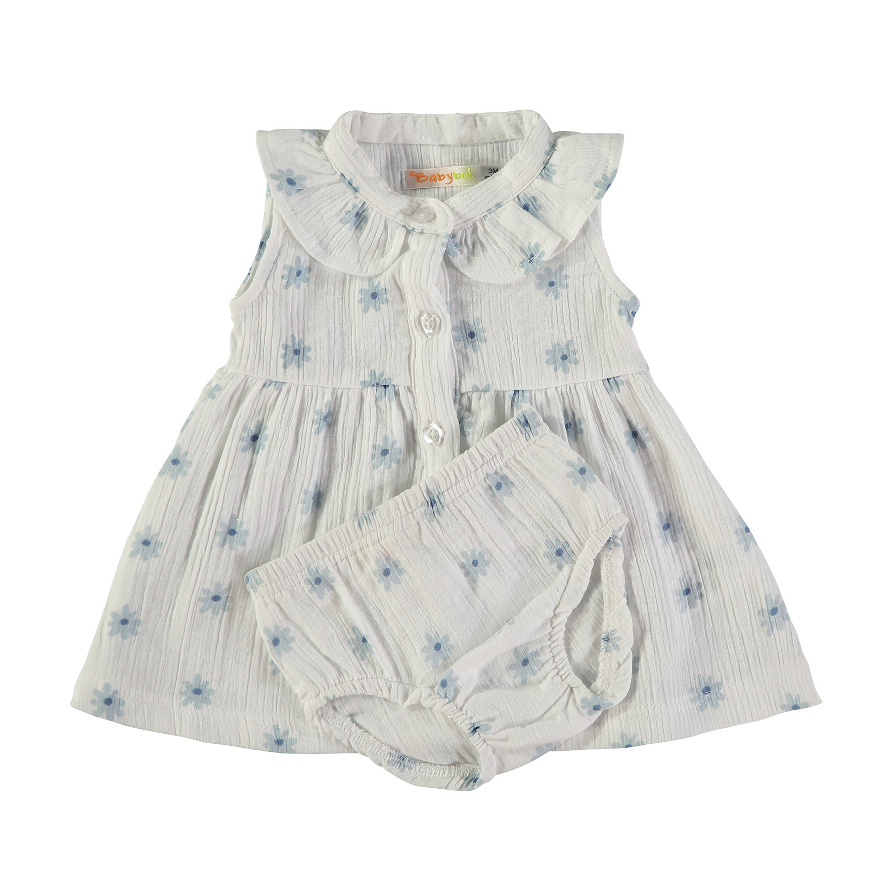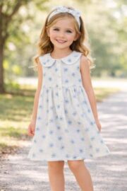 Ligero, fresco y lleno de ternura. Este delicado vestido en tono suave con pequeñas flores azules es perfecto para iluminar cualquier día. Su cuello redondeado aporta un aire clásico y encantador, mientras que su caída ligera permite libertad de movimiento y máxima comodidad.