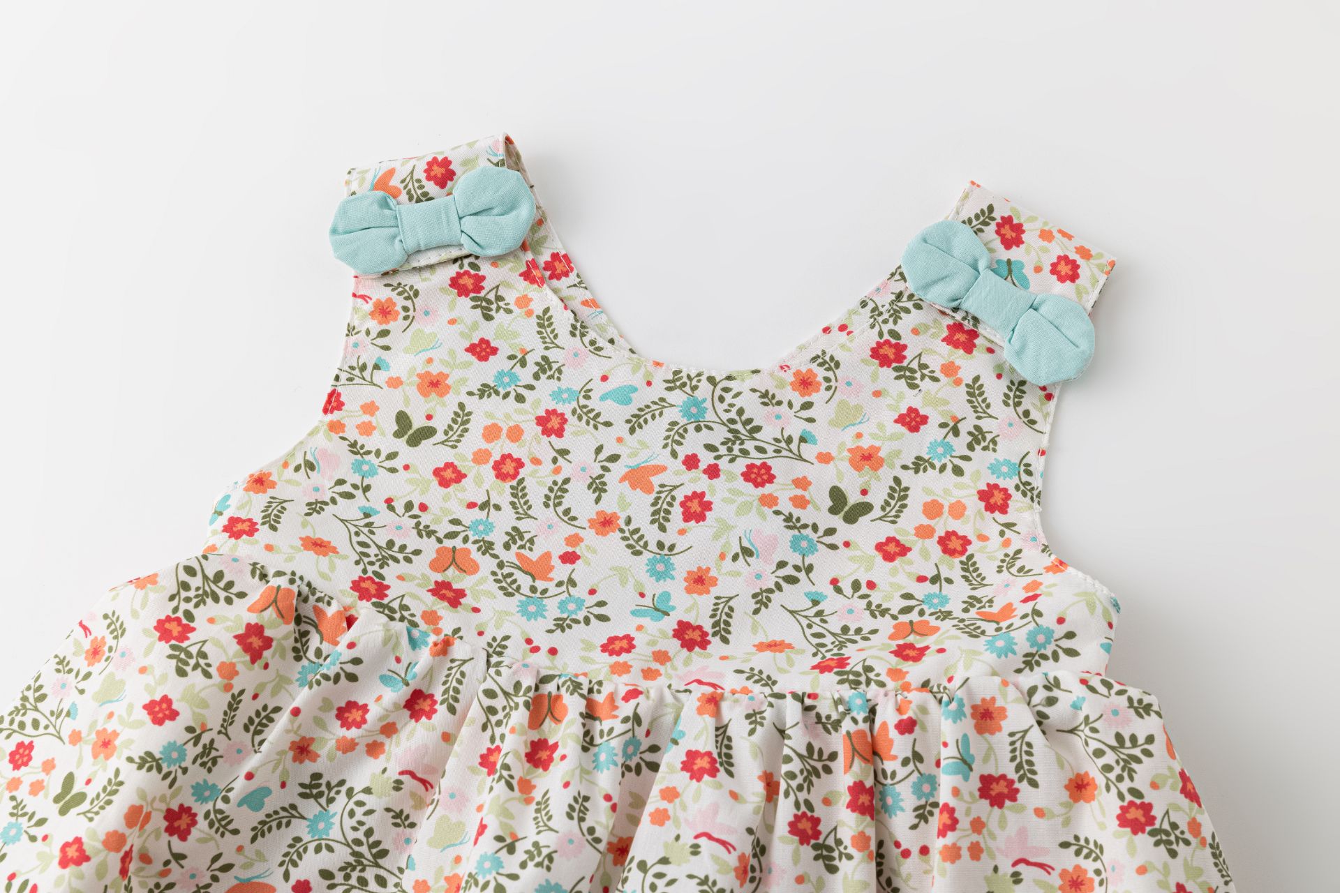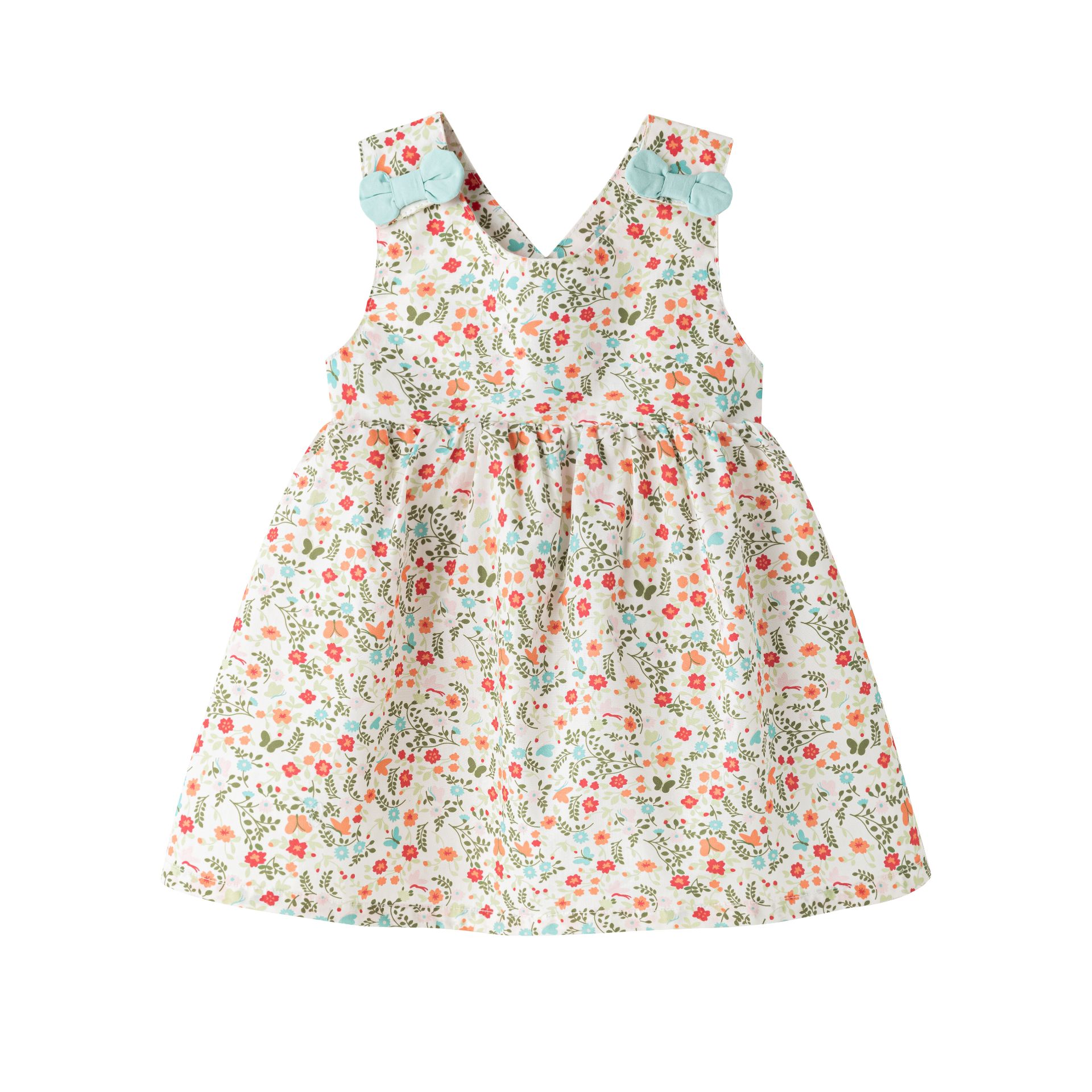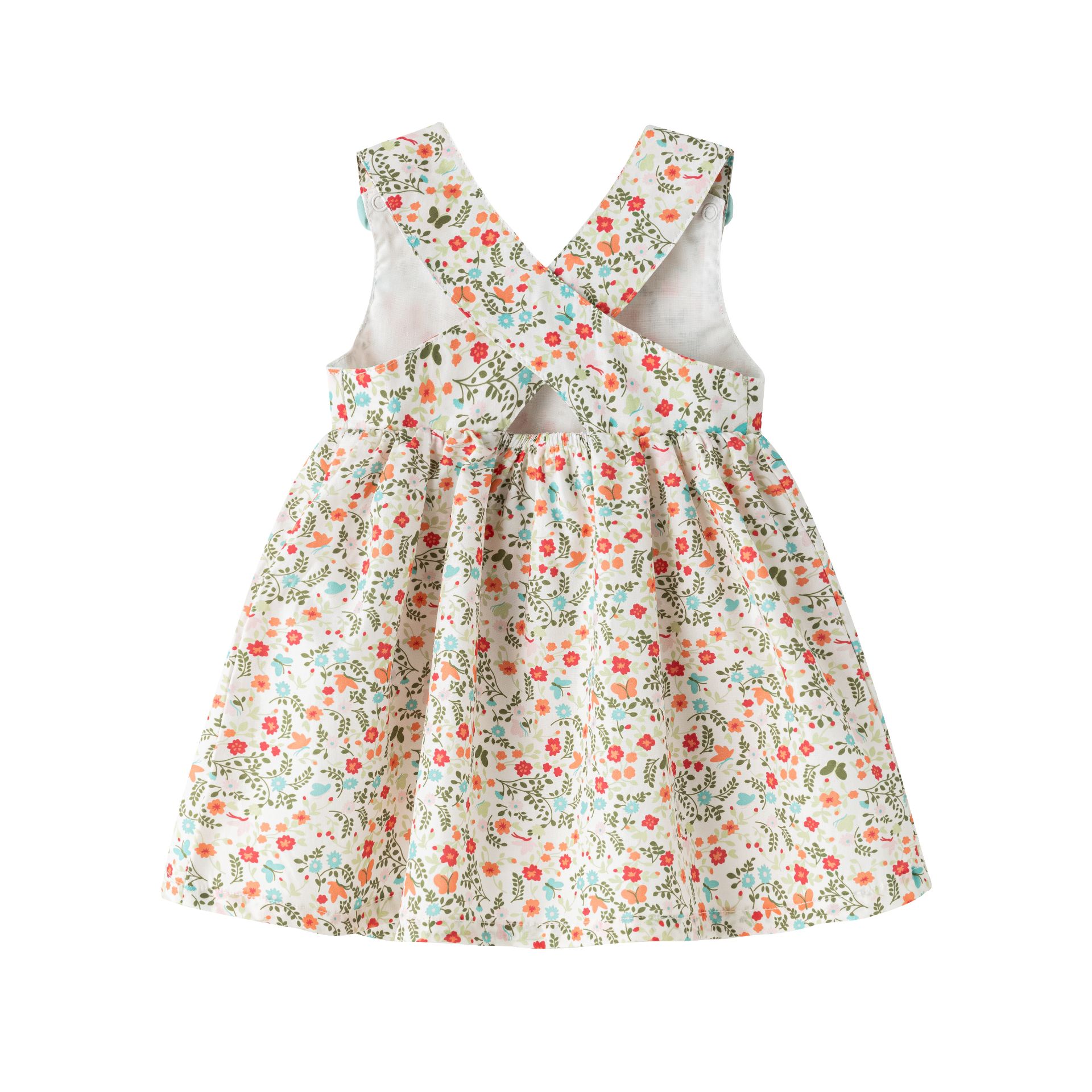 Vestido de tirantes con lazo decorativo en mismo tejido con espalda cruzada. En tejido 100% algodón con estampado de flores.